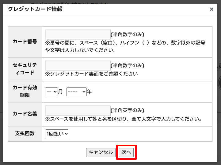 お客様のクレジット情報をご入力いただきましたら「次へ」をクリックしてください。
