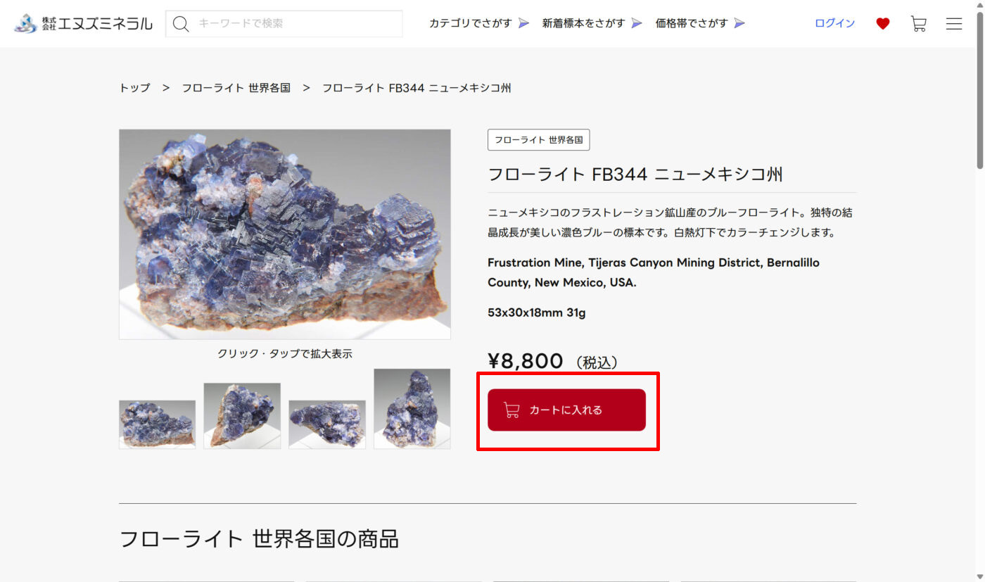 商品の詳細情報がページの右側に記載されており、右下に「カートに入れる」ボタンがあります。