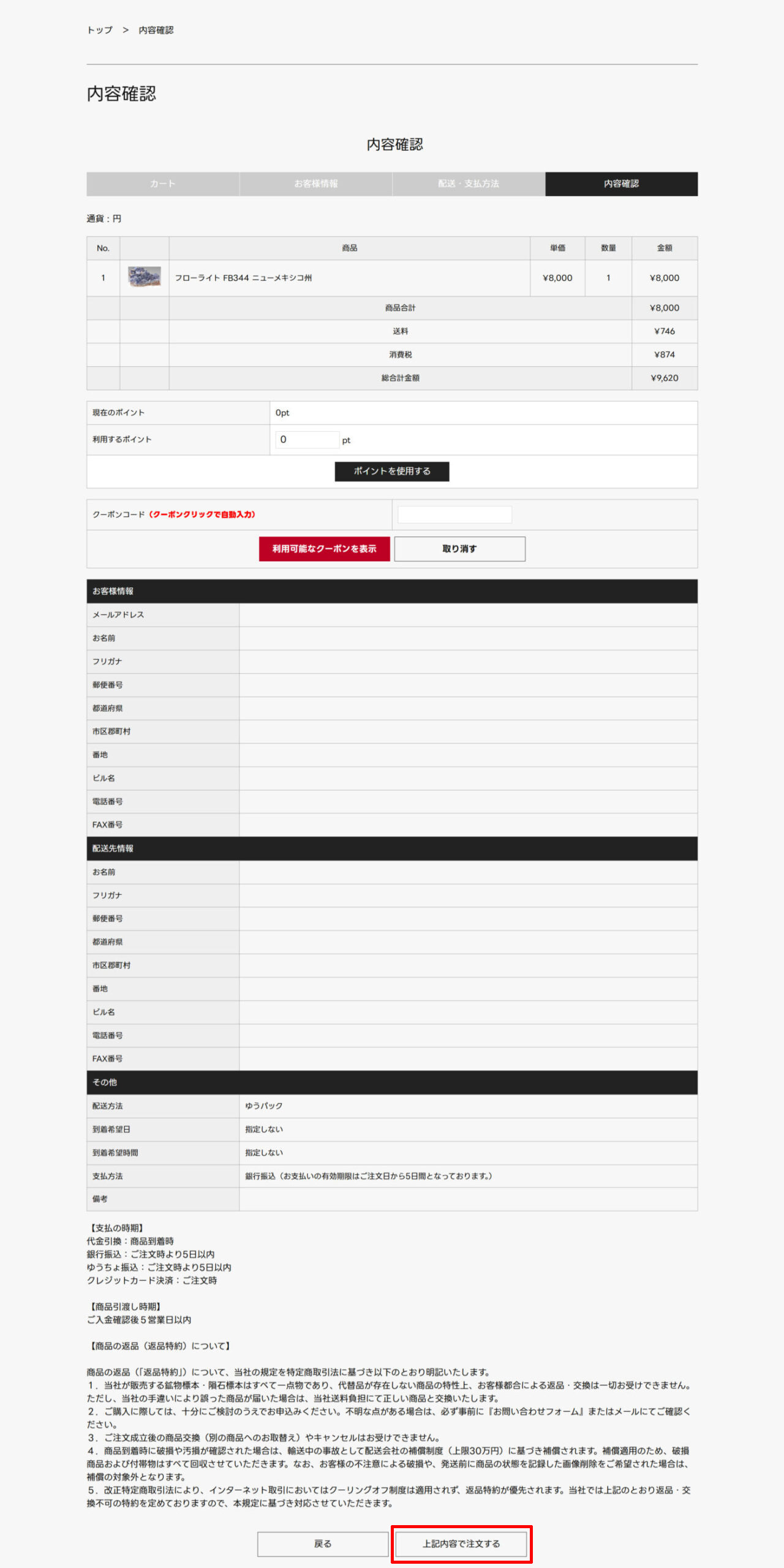 内容をよくご確認頂き、問題なければ「上記内容で注文」ボタンをクリックしてください。