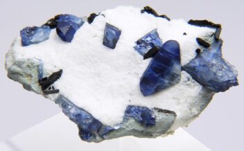 端正なベニト石の結晶群に海王石が共生します。紫外線短波で明るい蛍光を発します。キャビネットサイズ。