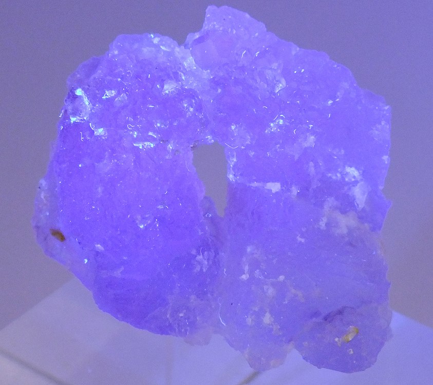 熱水のエッチングをうけて偶々リング形状を呈したライトピンクの結晶群です。紫外線長波で蛍光します。