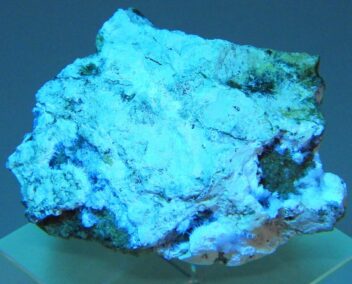 産出が稀なCuとZnの含水燐酸塩鉱物。空隙に密生した青緑色のリッチな結晶群で亜鉛燐銅鉱を伴います。