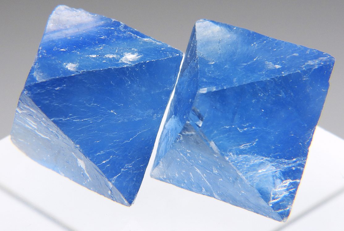 ニューメキシコのブルーフローライトを劈開面に沿って八面体にカットした標本です。白熱灯下でカラーチェンジします。2個セット。