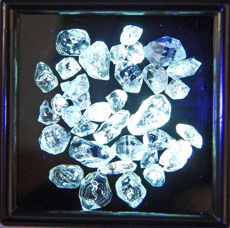 パキスタン産のオイル入り水晶です。原油に由来するメタンガスを内包します。紫外線長波で原油部分が極めて明るい蛍光を発します。33点セット。