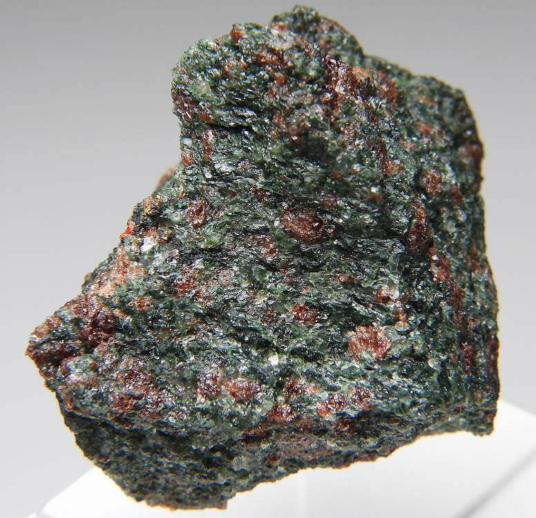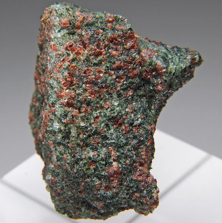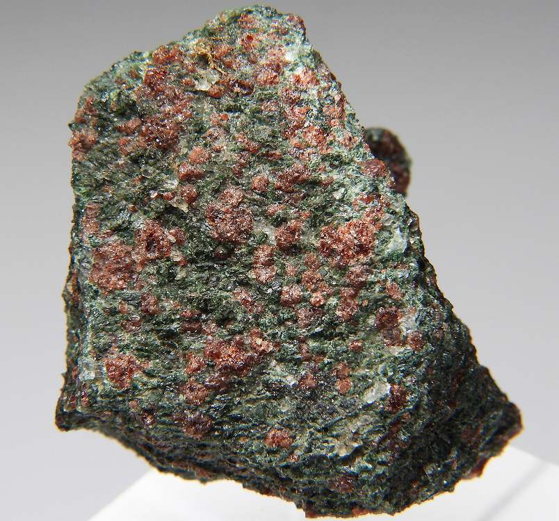 オンファス輝石とクロム雲母に赤色のパイロープが見られるエクロジャイトです。高温高圧下で作られた変成岩です。