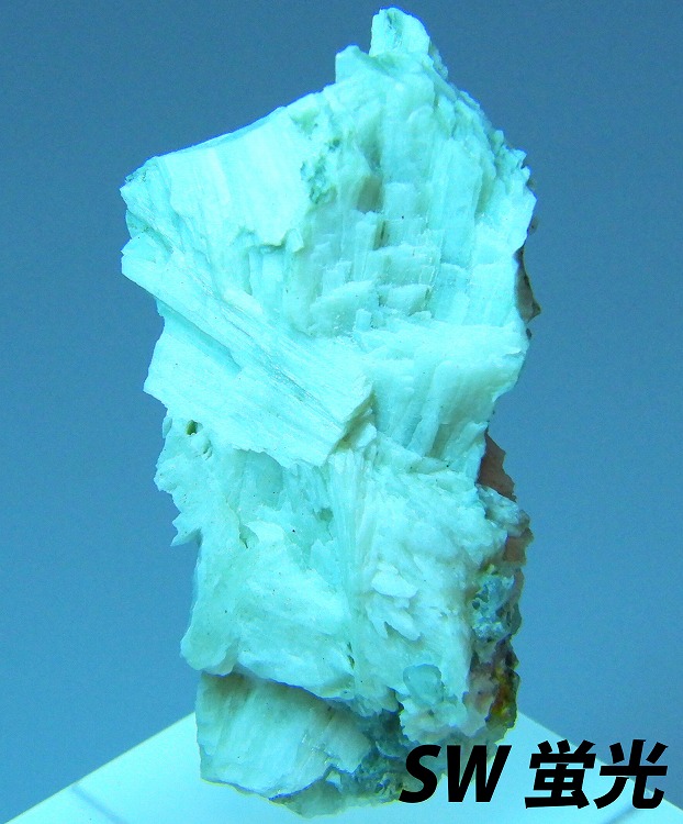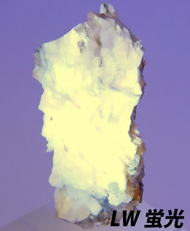 希少なソレンセン石の結晶群。この個体は紫外線長波・短波の両方で蛍光が見られます。原産地標本。