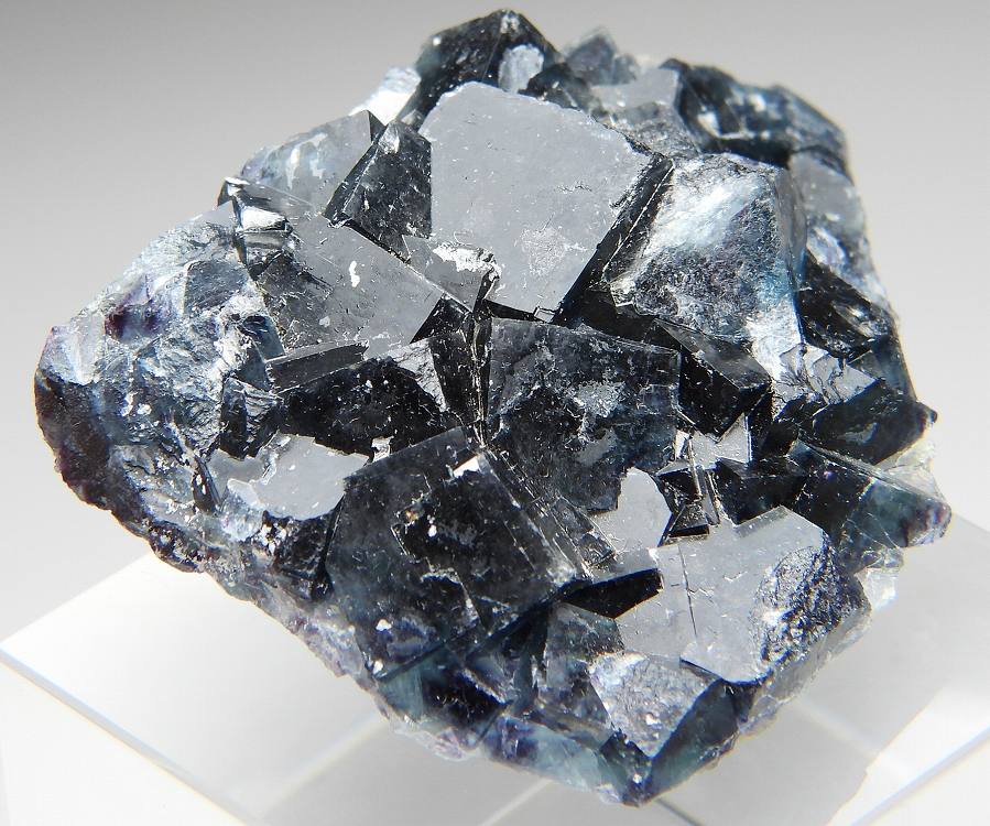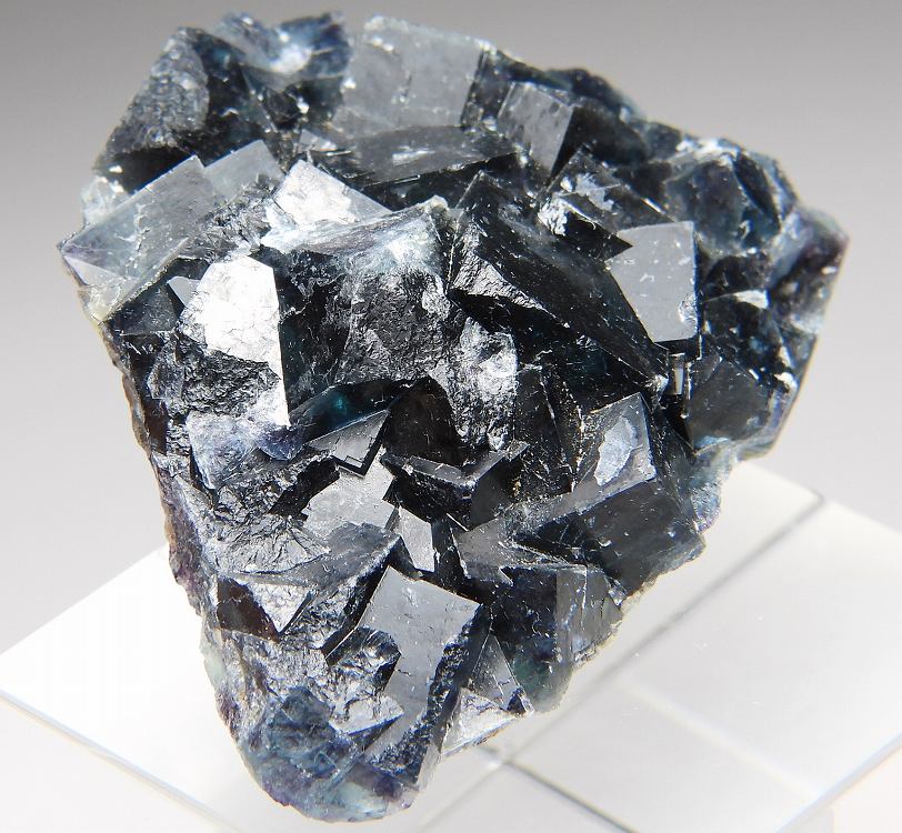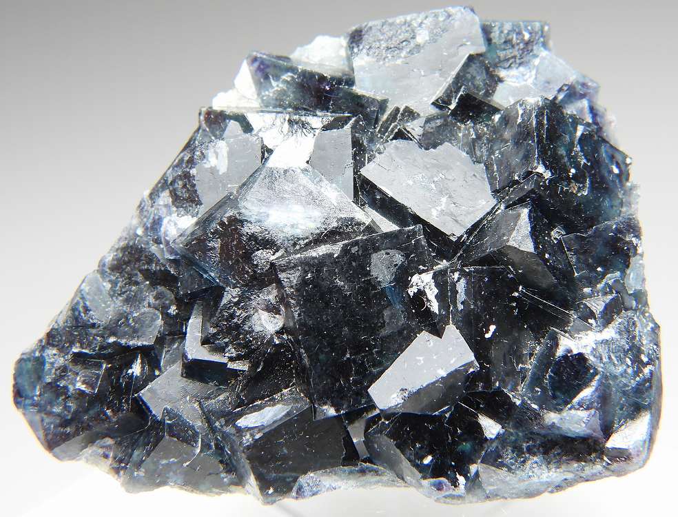 深いマリンブルーベースの美しく艶やかな結晶群。紫外線長波で蛍光します。