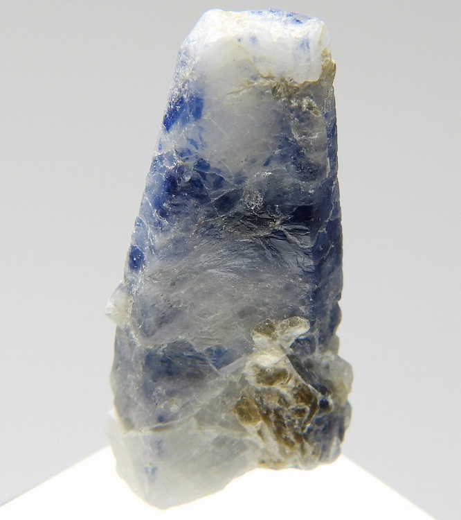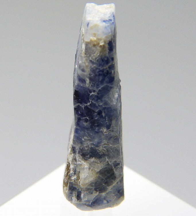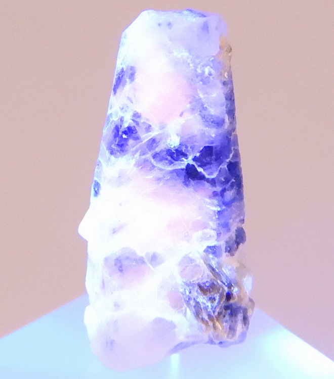 サファイアの単結晶。紫外線長波で白色部が蛍光を示します。