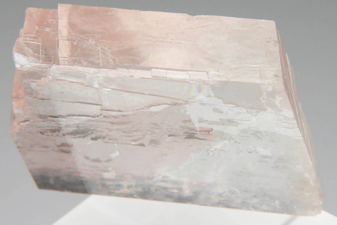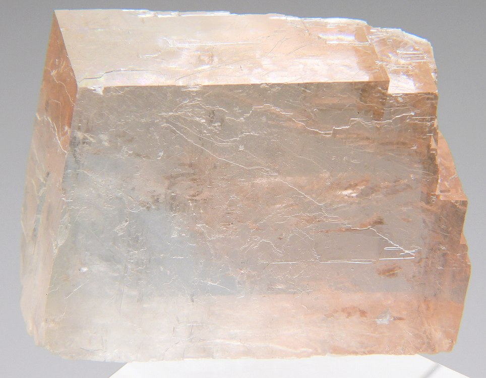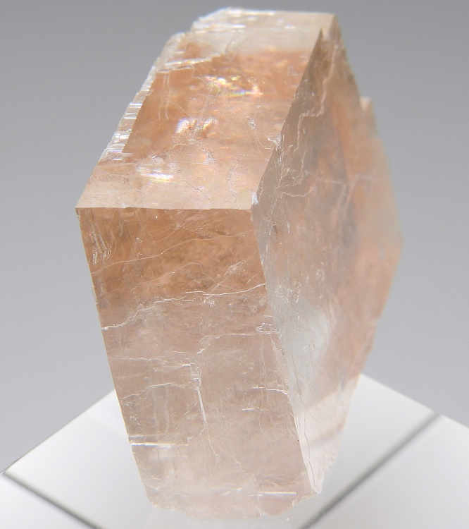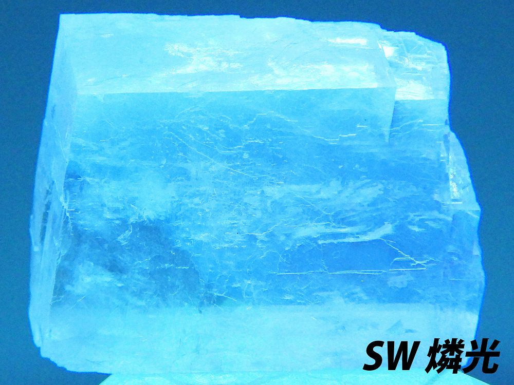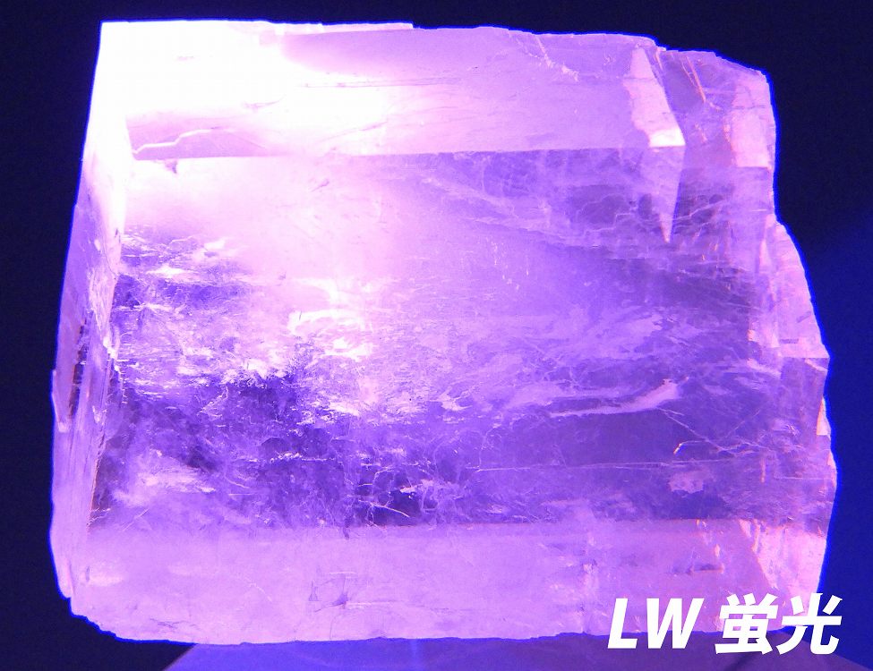 透明度の高いペールオレンジのオプティカルカルサイト。紫外線長波で蛍光し短波照射後には強い燐光を発します。