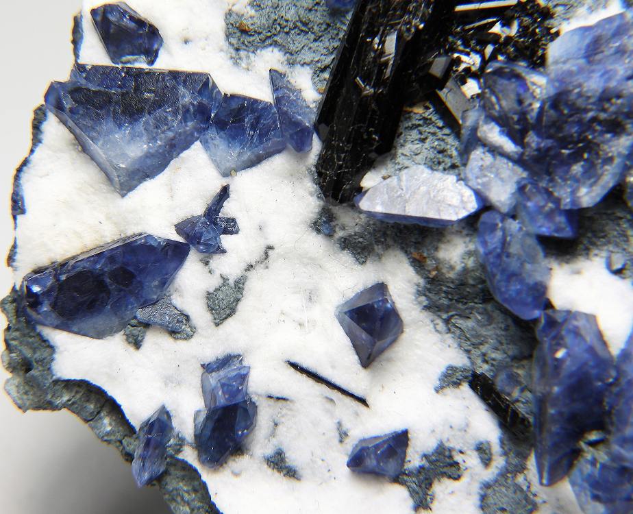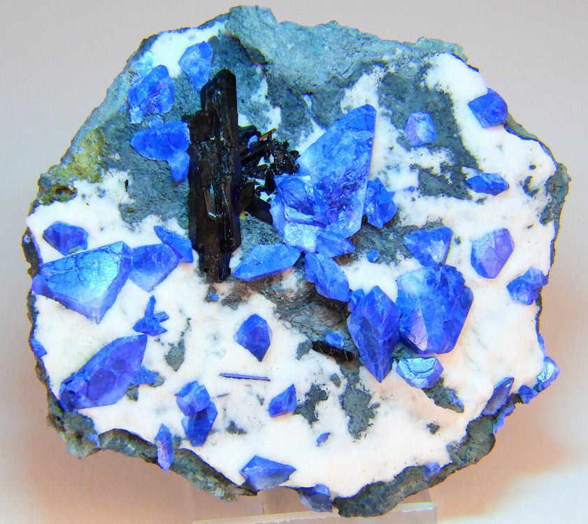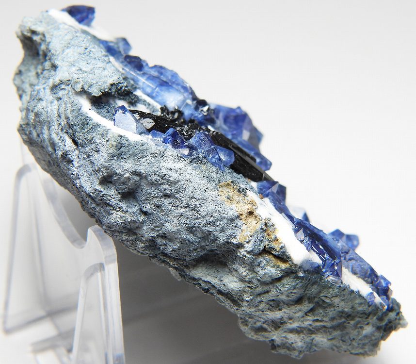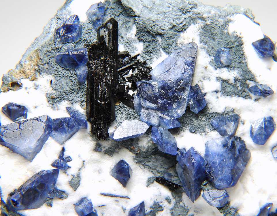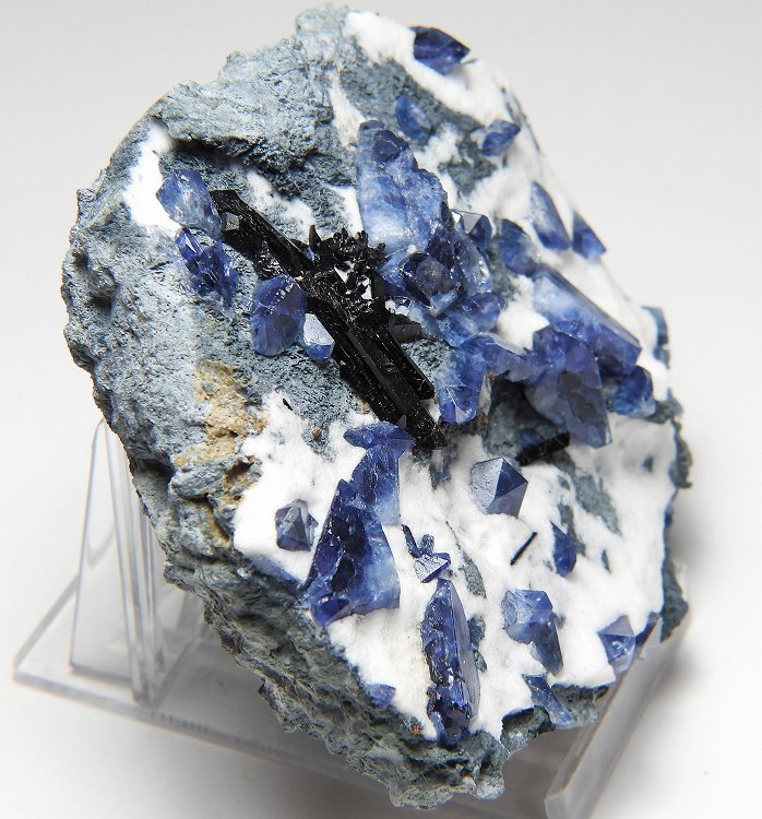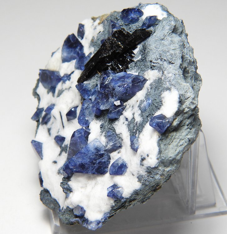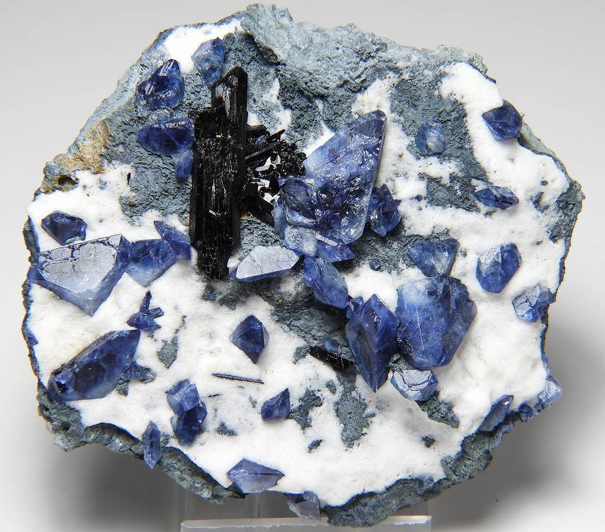 端正なベニト石の結晶群に海王石が共生します。紫外線短波で明るい蛍光を発します。キャビネットサイズ。