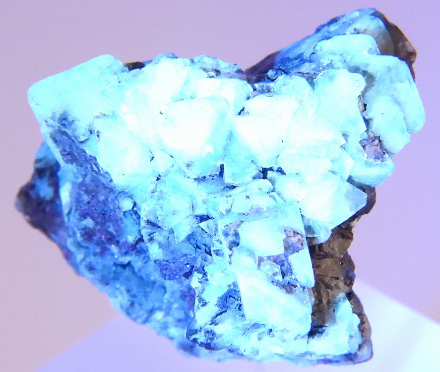 組成内に有機基を持つ珍しい有機鉱物。Alと結合しており紫外線長波で蛍光・燐光を発します。リッチな結晶群です。