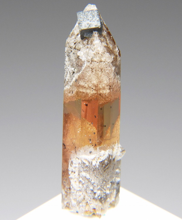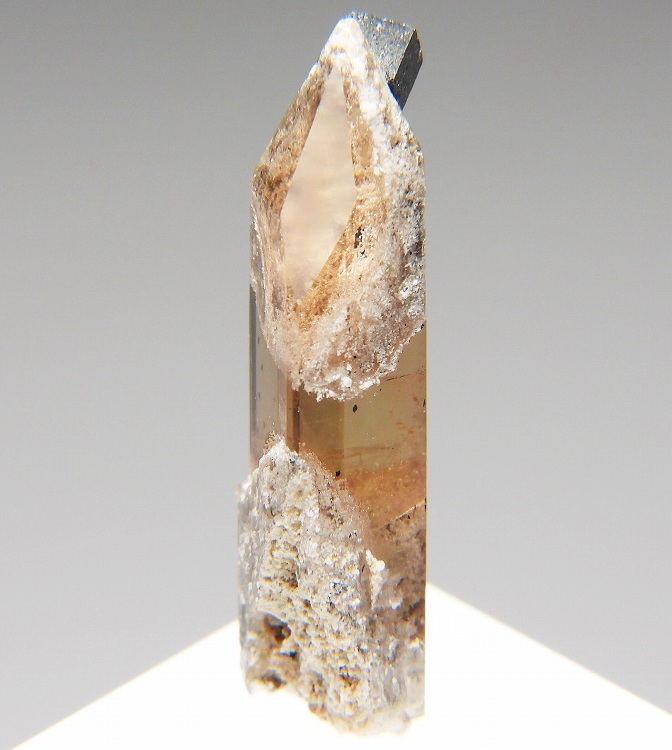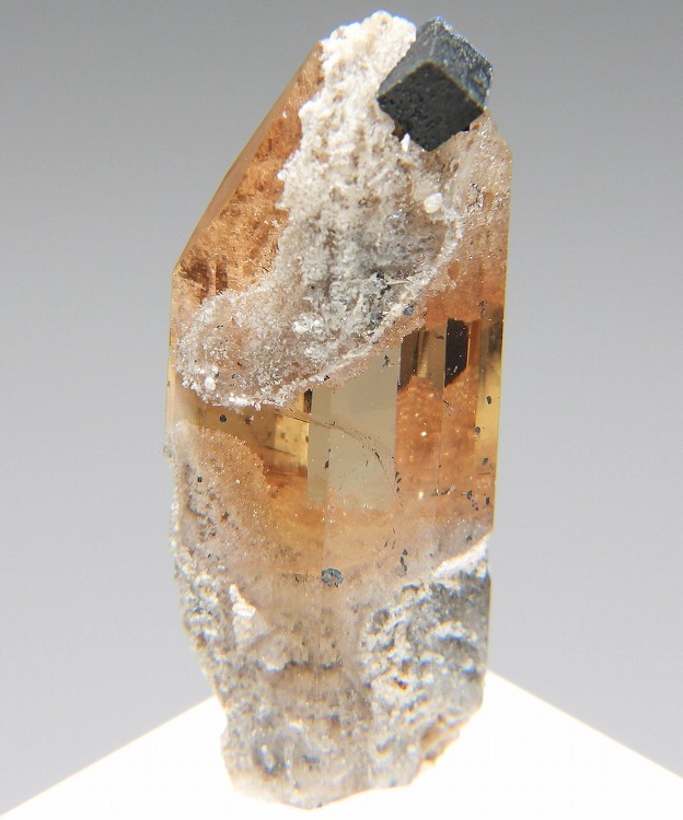 流紋岩中から産するこの産地のトパーズでは大きな結晶です。先端部にビクスビ石が共生します。