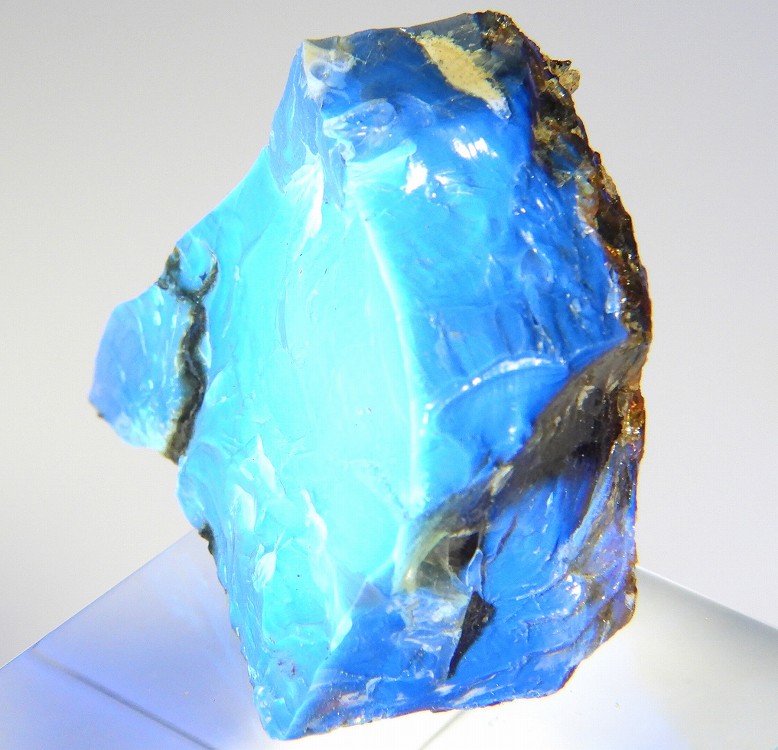 インドネシア産のブルーアンバー。紫外線長波を照射すると明るい蛍光を発します。