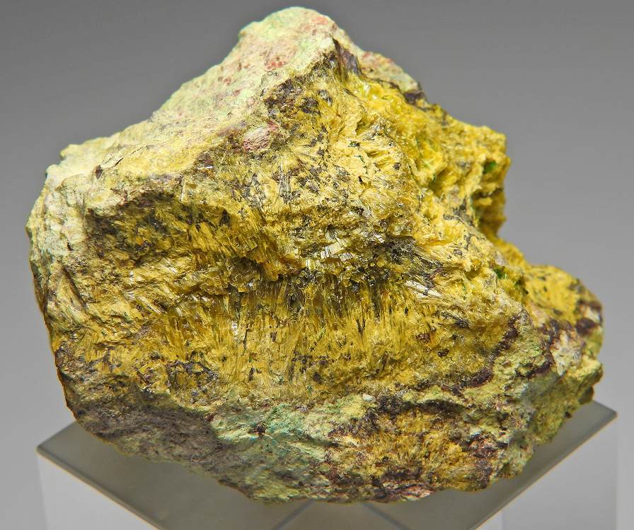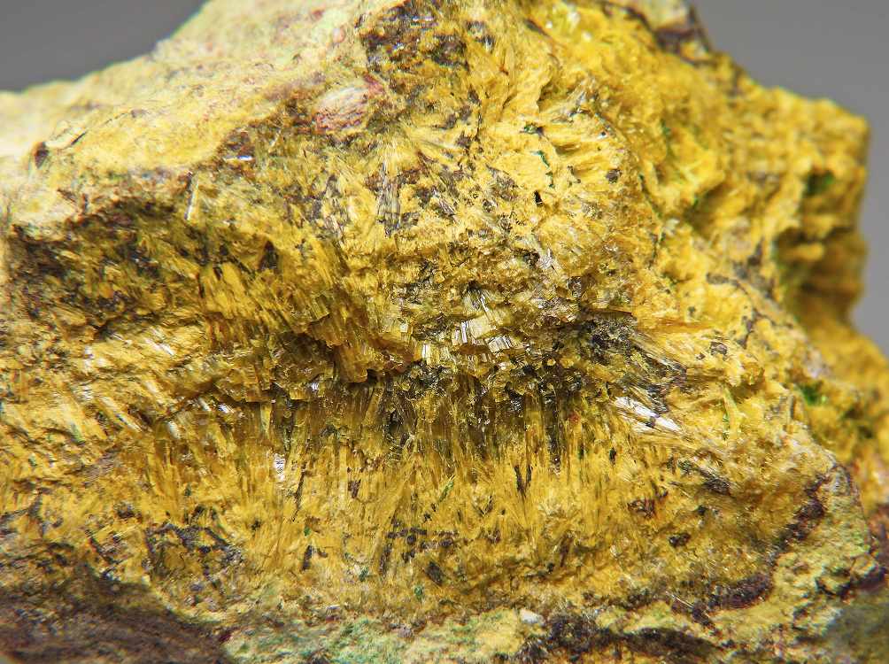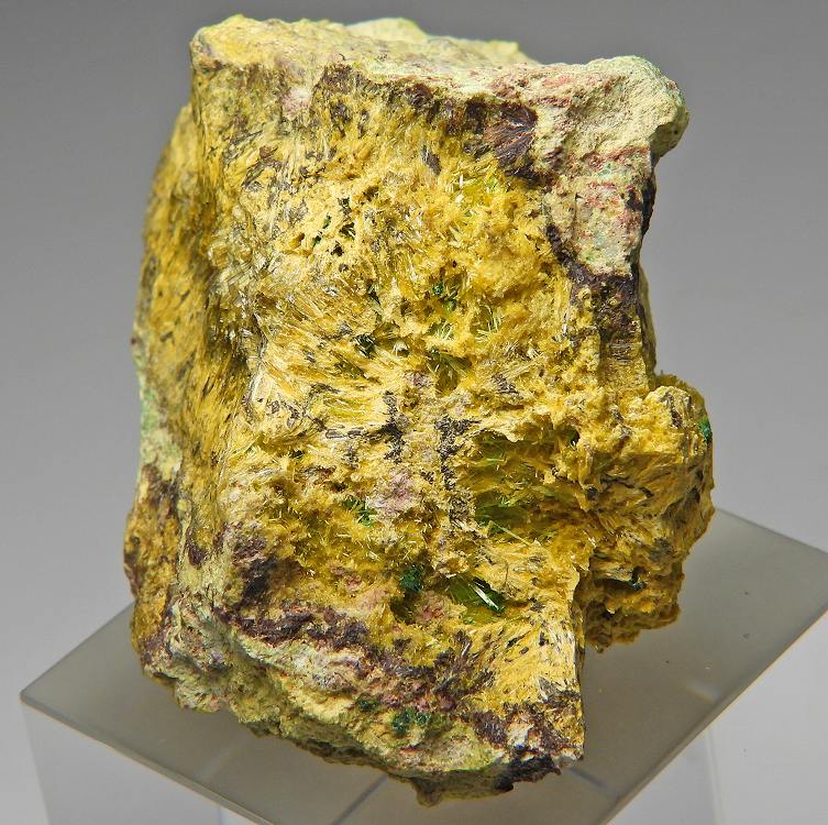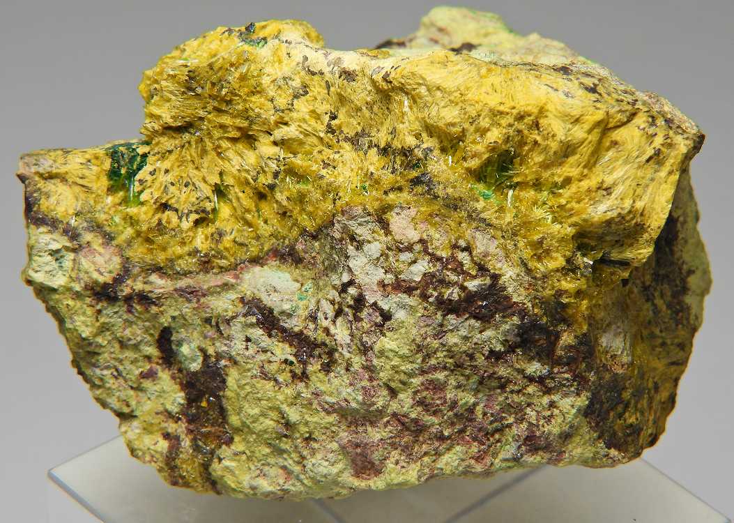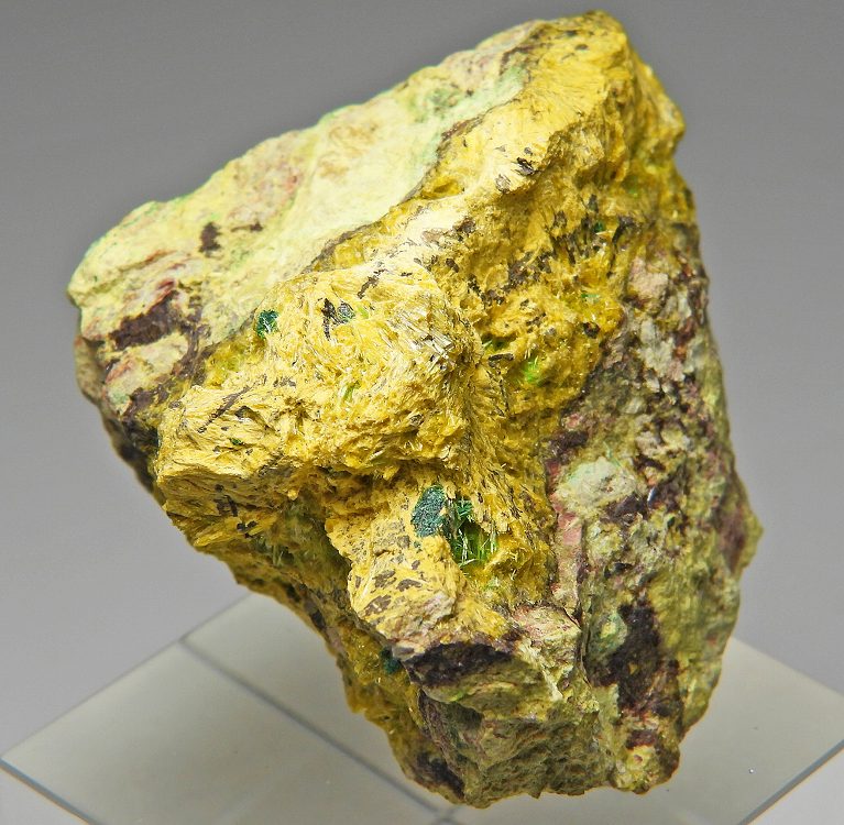 スクロドフスカ石の放射状結晶にソディアイトが共生する大変リッチな標本です。表面線量約600μSv/h。