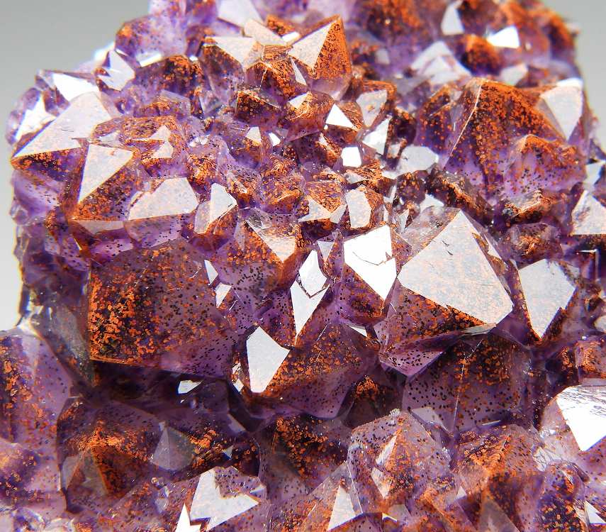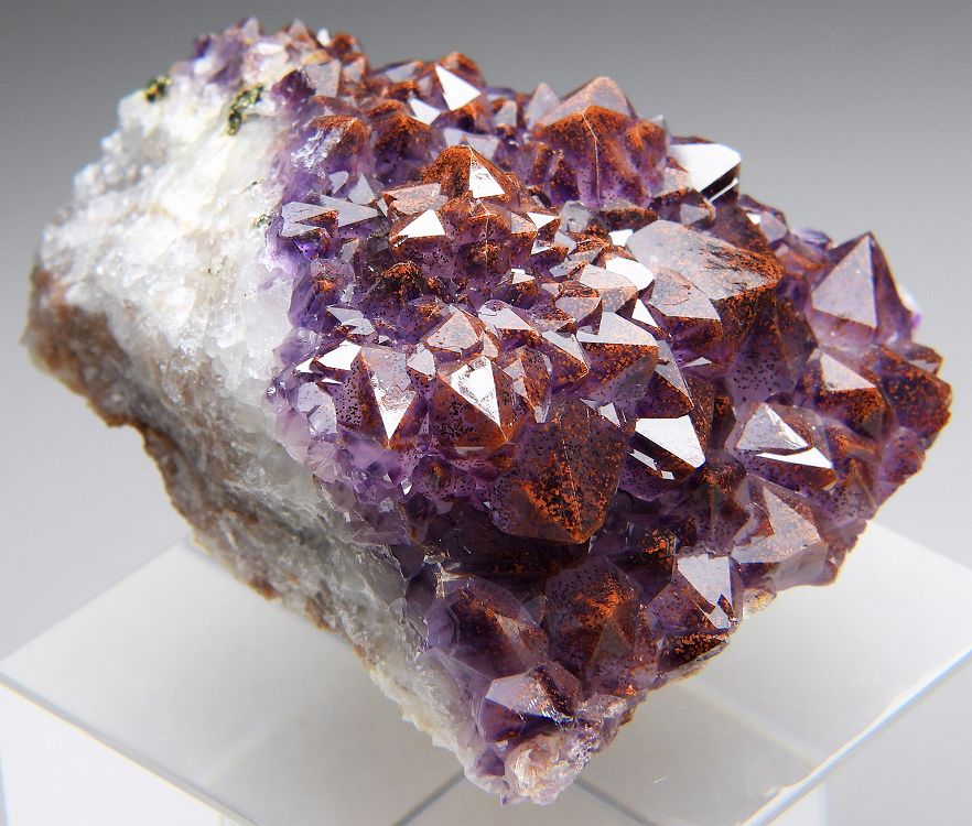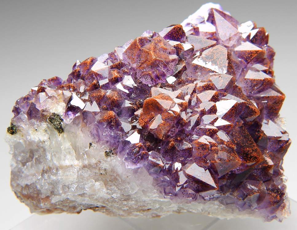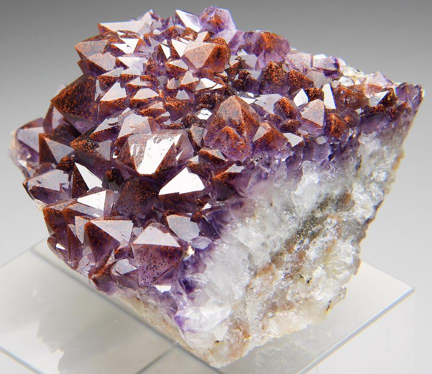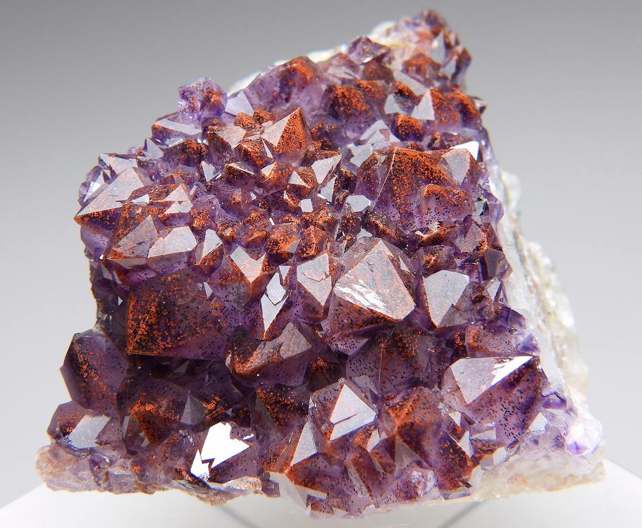 赤鉄鉱をインクして赤く染まった艶やかなアメシストの結晶群。サンダーベイの名品です。