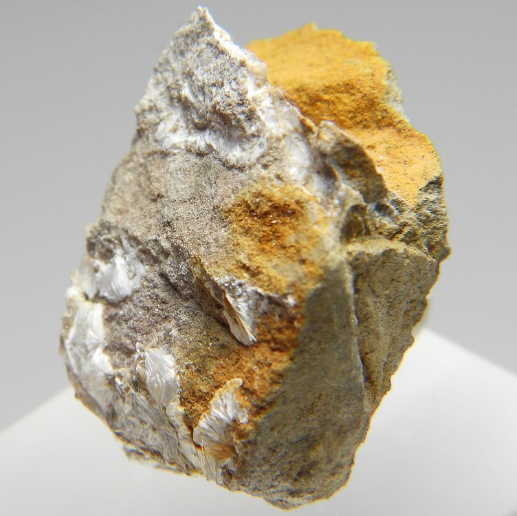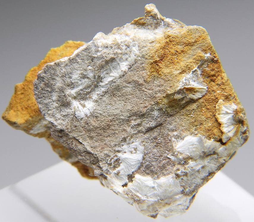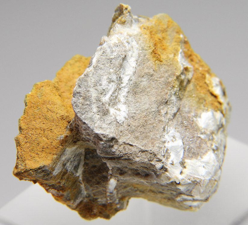 ドーソン石とアルモハイドロカルサイトの混在した放射状結晶群が見られます。紫外線長波で蛍光します。