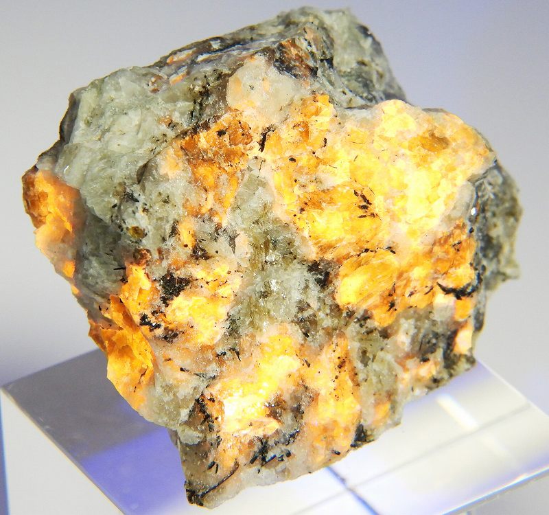 強い蛍光性の方ソーダ石で紫外線長波で非常に明るいオレンジ色の蛍光を発します。短波紫外線照射でハックマン石と同様のテネブレッセンスが見られます。(原産地標本)
