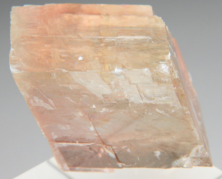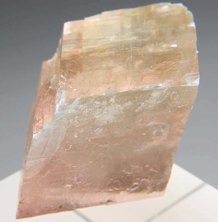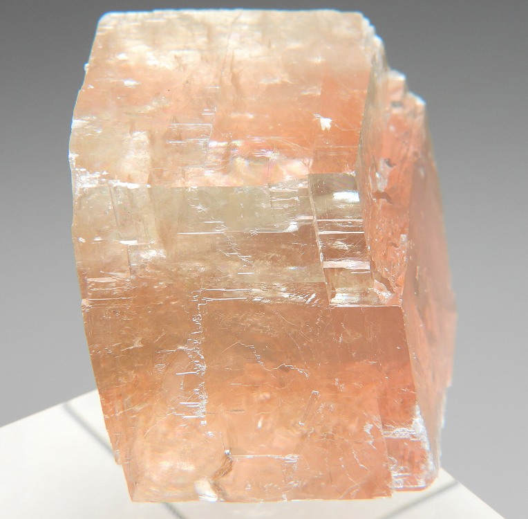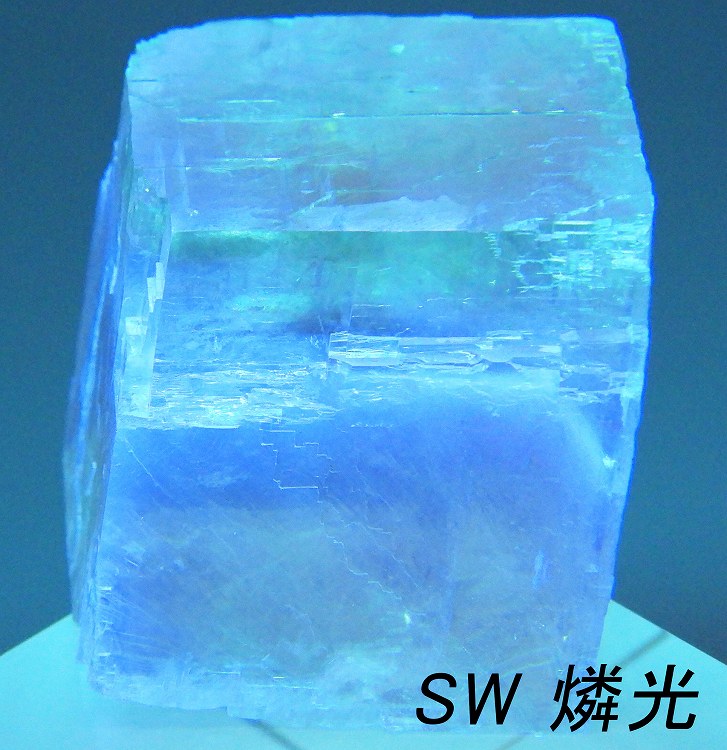 透明度の高いペールオレンジのオプティカルカルサイト。紫外線長波で蛍光し短波照射後には強い燐光を発します。