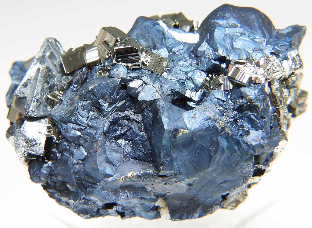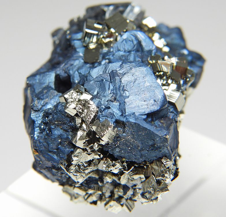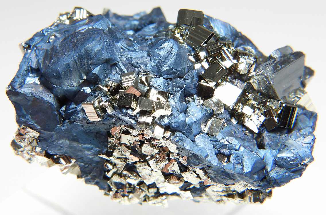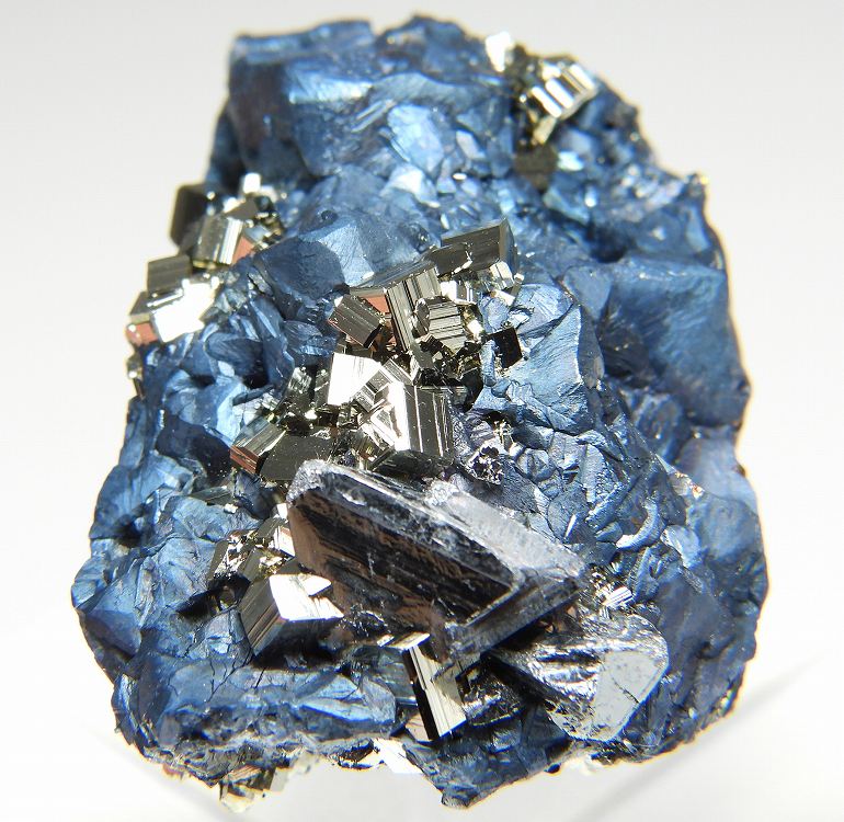 黄鉄鉱に共生した鮮やかなイリデッセンスの斑銅鉱。安四面銅鉱も共生します。