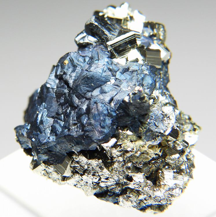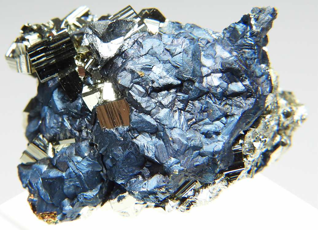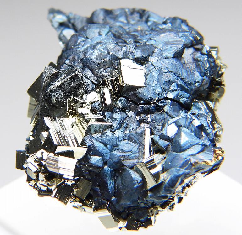 黄鉄鉱に共生した鮮やかなイリデッセンスの斑銅鉱。安四面銅鉱も共生します。