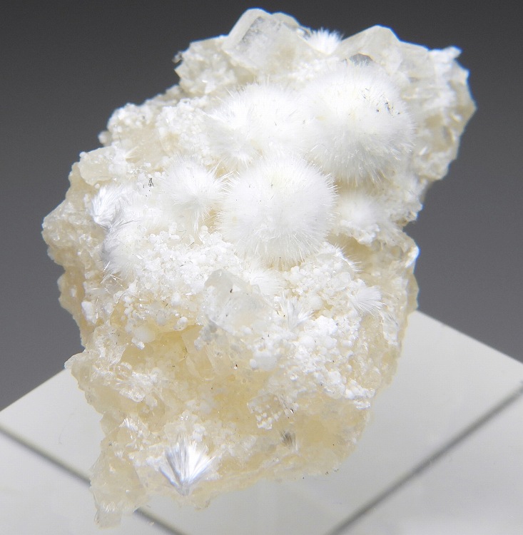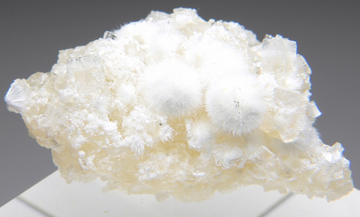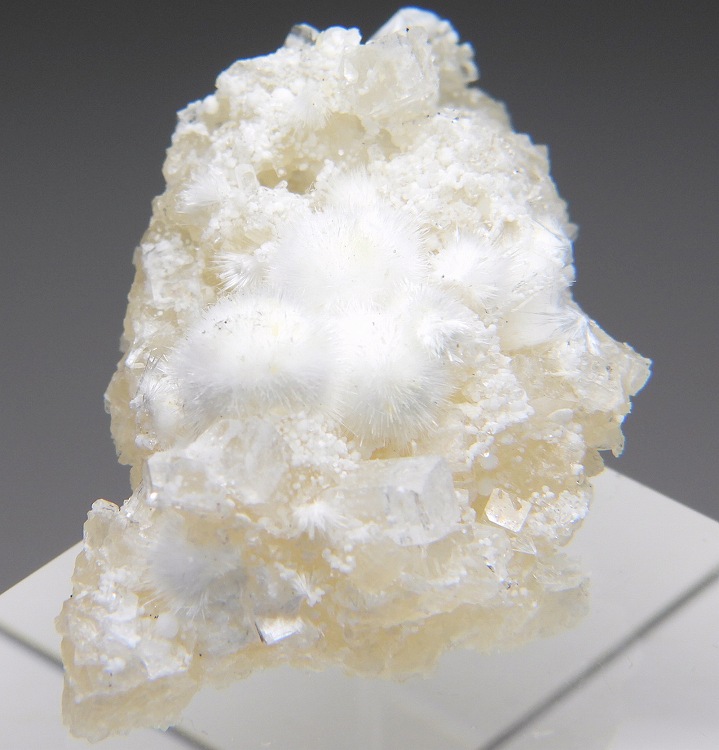 ぶどう石上に成長したオーケン石の結晶群。魚眼石とギロル石が共生します。