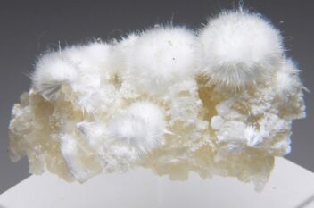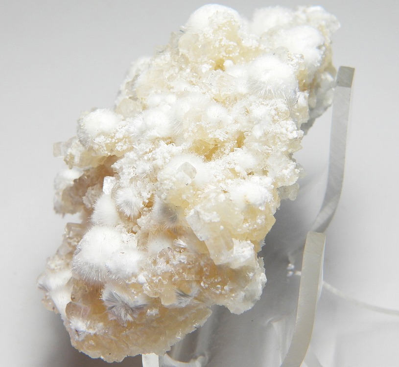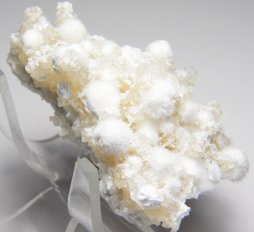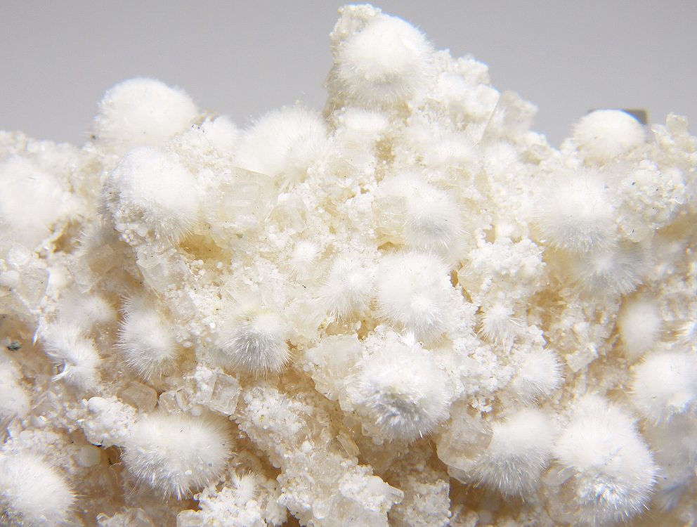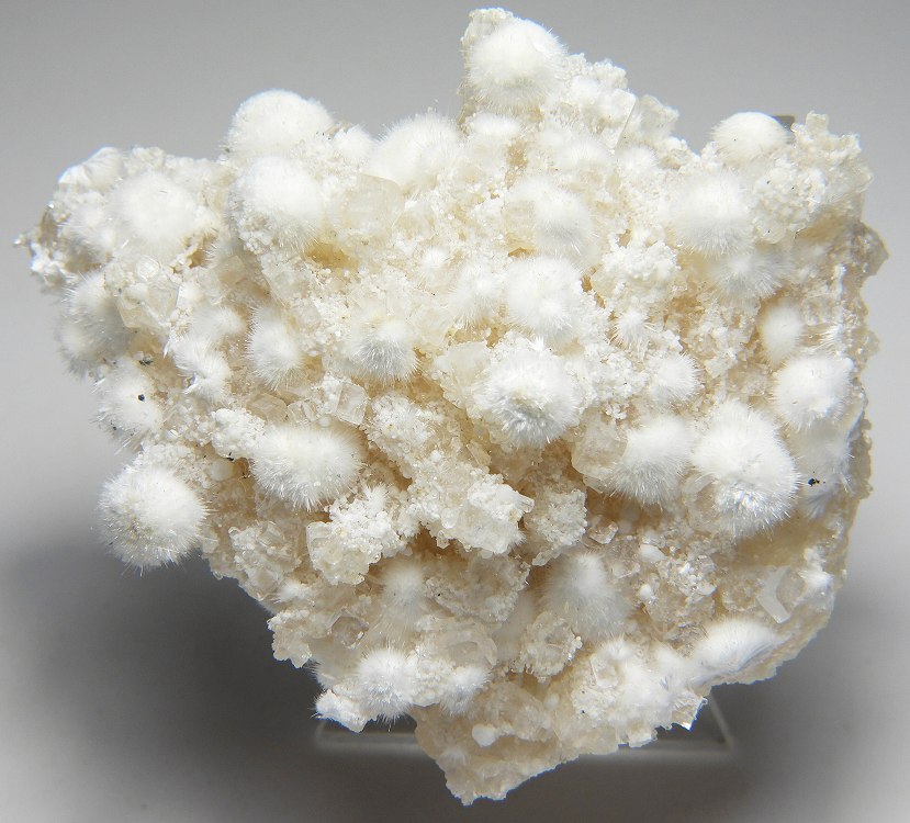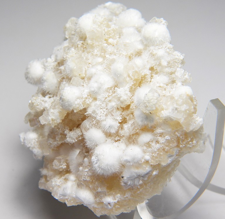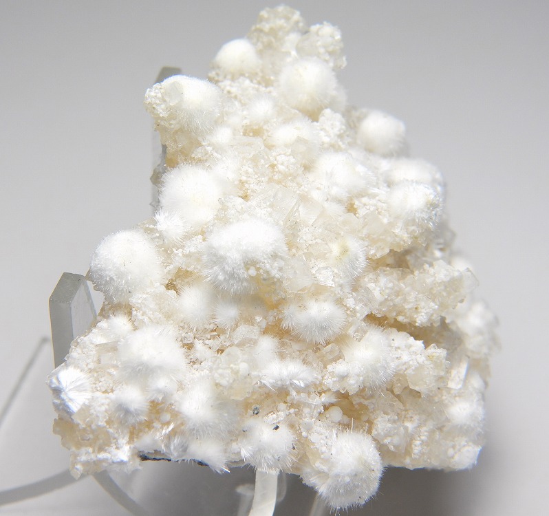ぶどう石上に成長したオーケン石のリッチな結晶群。魚眼石とギロル石が共生します。