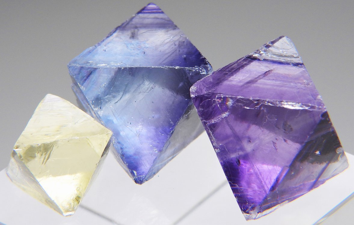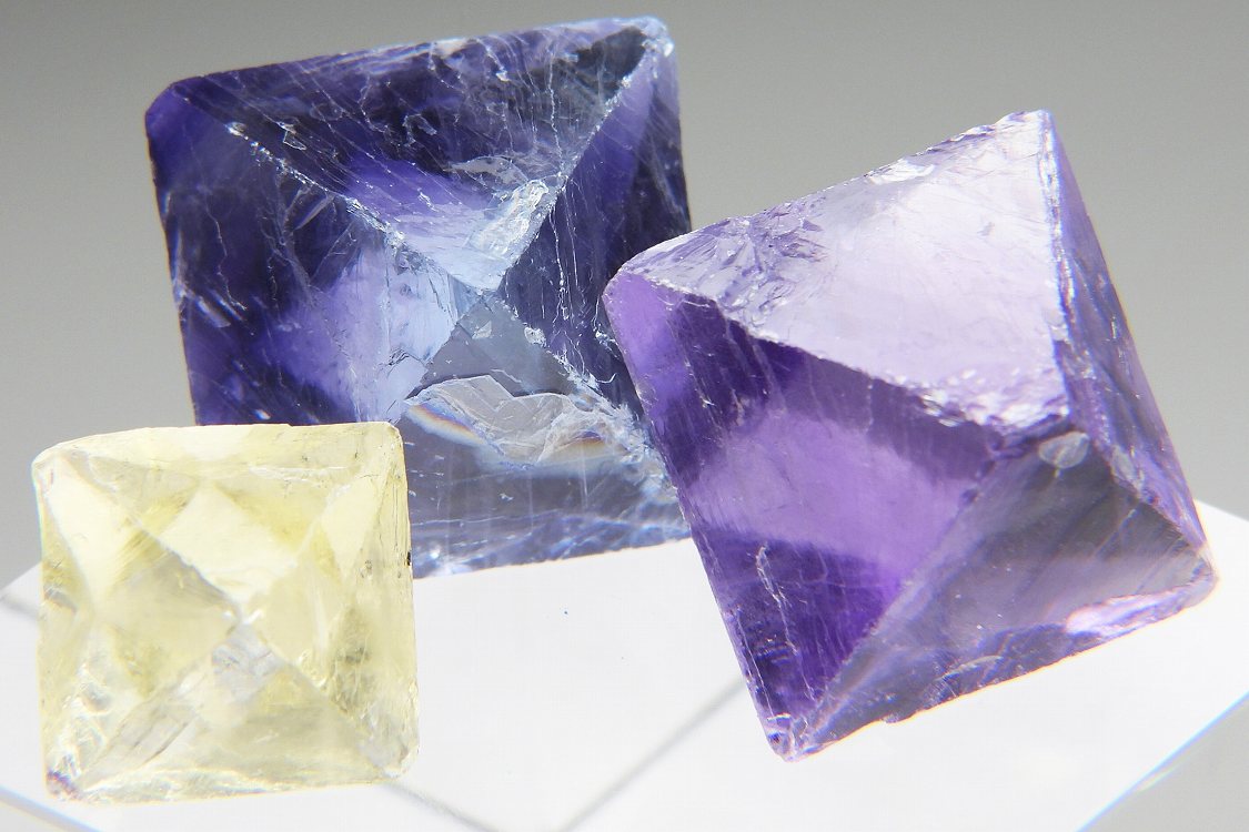 往年のイリノイ産フローライトを劈開面に沿って八面体にカットした標本です。紫外線長波で蛍光し白熱灯下でカラーチェンジします。3個セット。