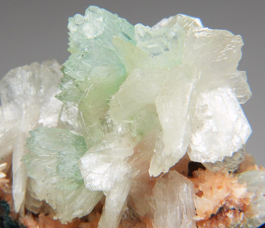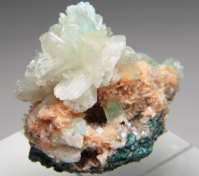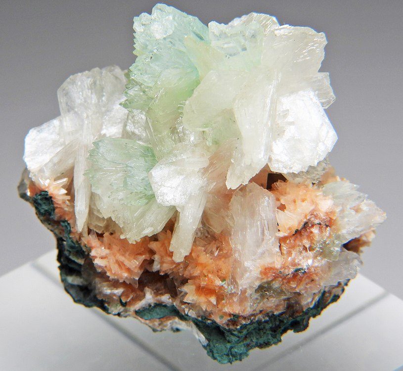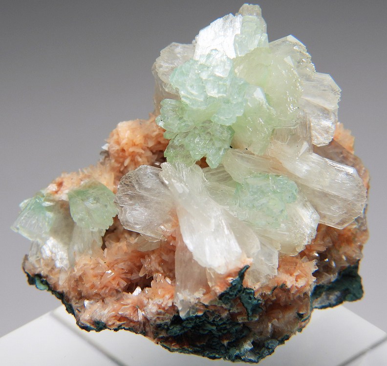 輝沸石と束沸石に共生した放射状の美しいグリーン魚眼石の結晶群です。