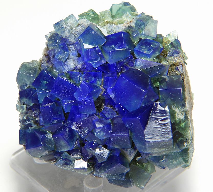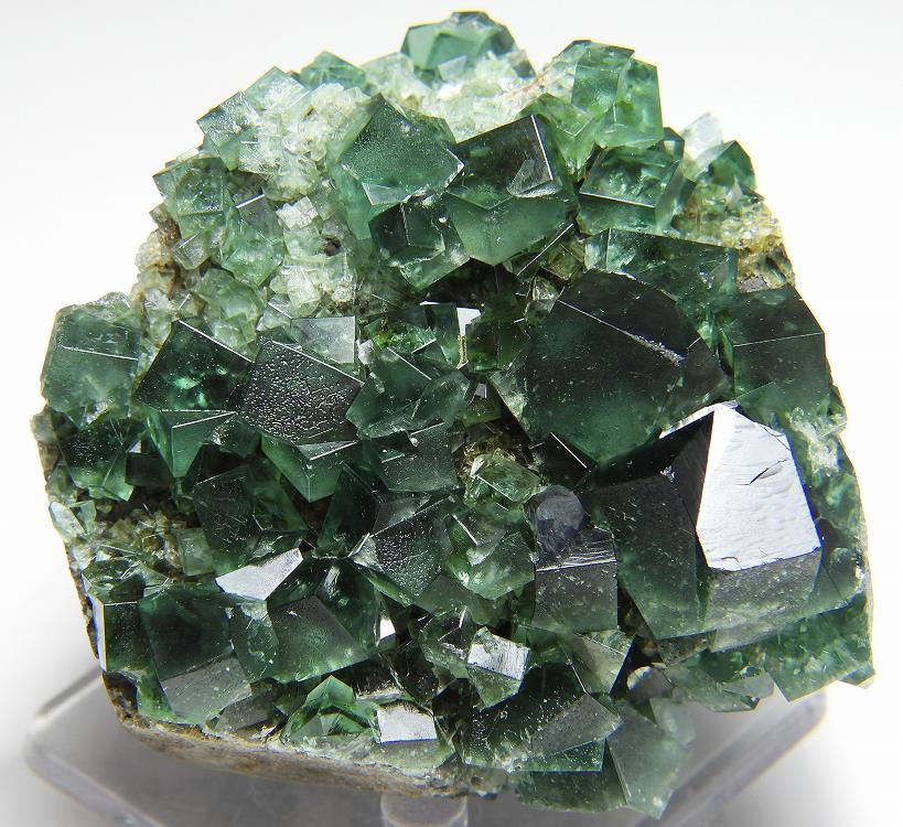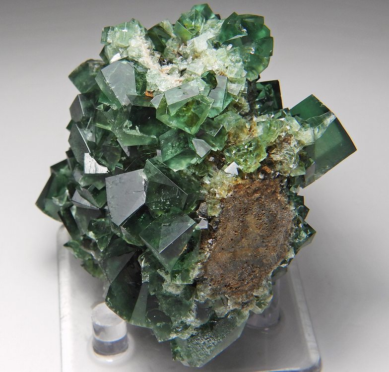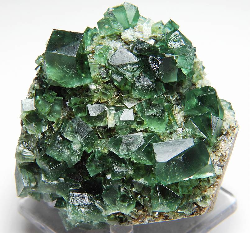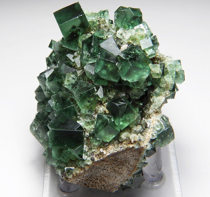 Pocket 42から産した高い透明度の美しい結晶群。太陽光や紫外線長波で蛍光します。表裏に結晶が見られるキャビネットサイズの標本です。