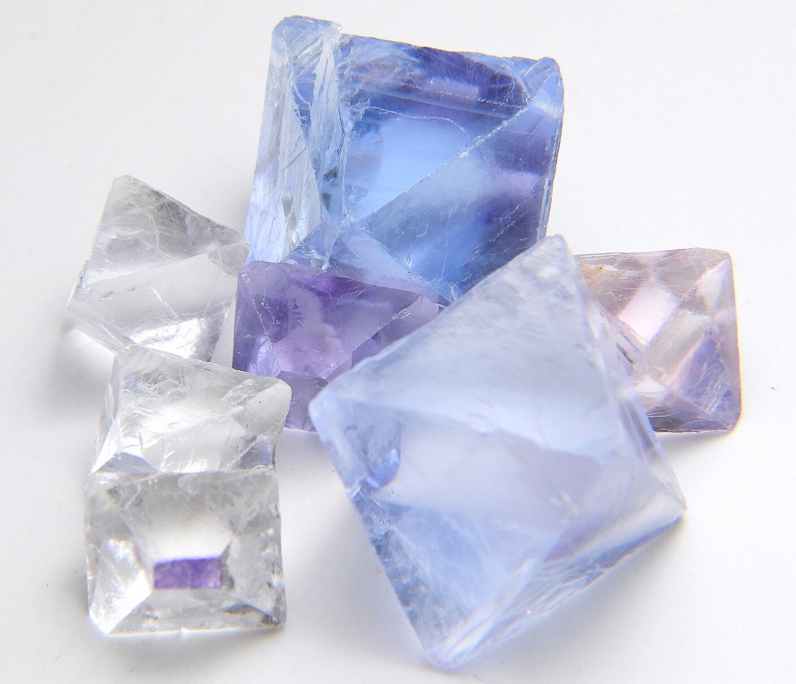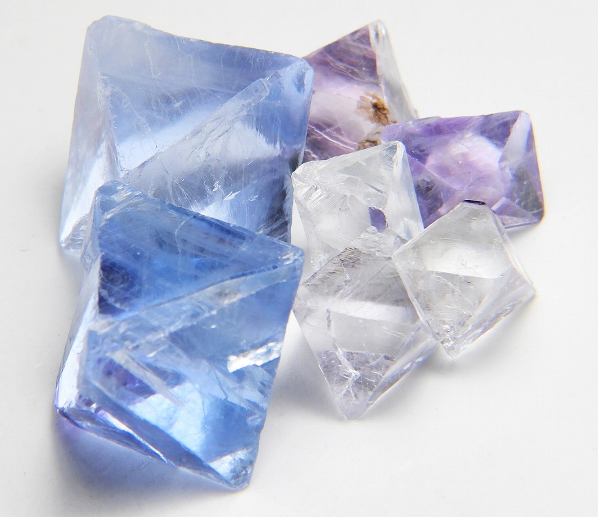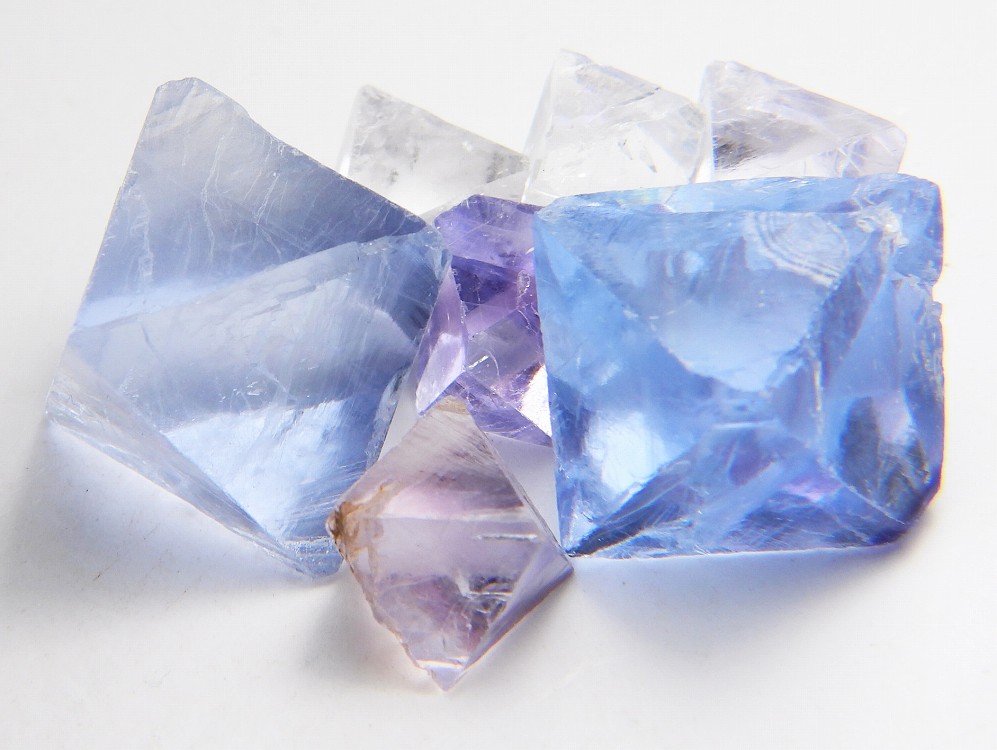 往年のイリノイ産フローライトを劈開面に沿って八面体にカットした標本です。紫外線長波で蛍光し白熱灯下でカラーチェンジします。7個セット。
