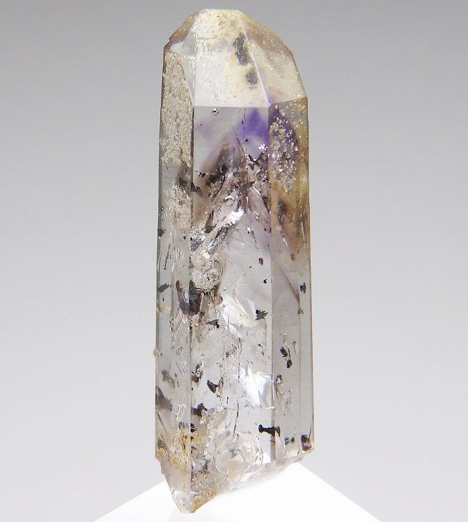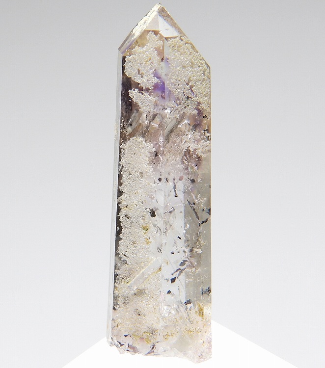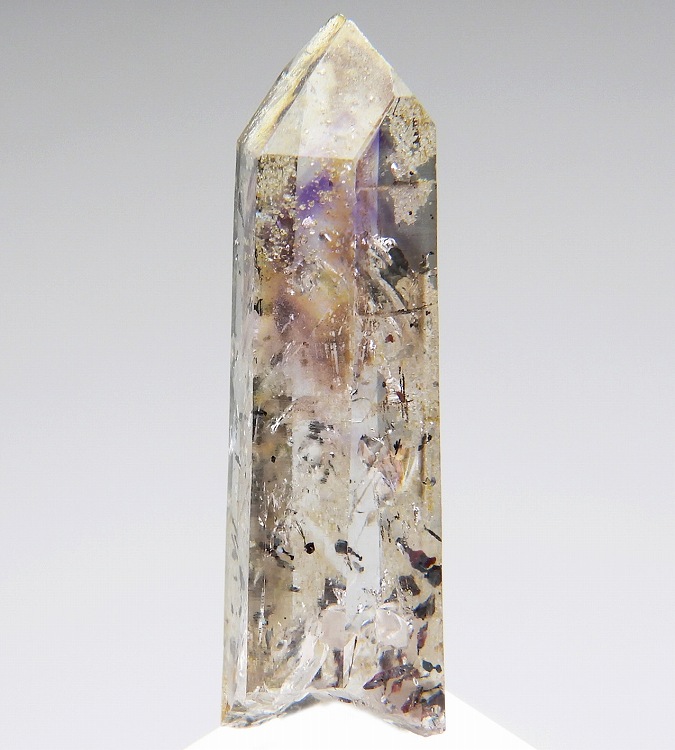 ブランドバーグ産のアメシスト。赤鉄鉱や針鉄鉱のインクや負晶が見られ内部は気泡が動きます。