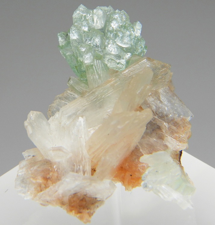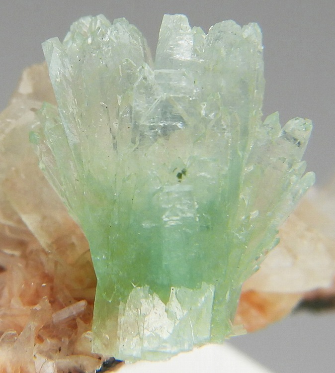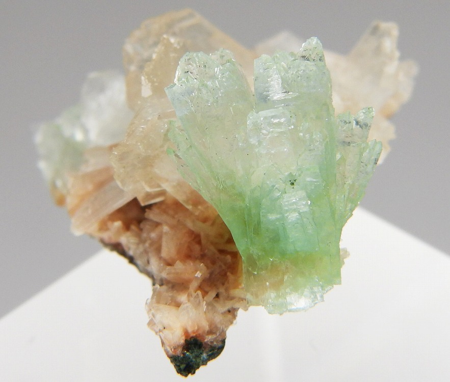 輝沸石と束沸石に共生した放射状の美しいグリーン魚眼石の結晶群です。