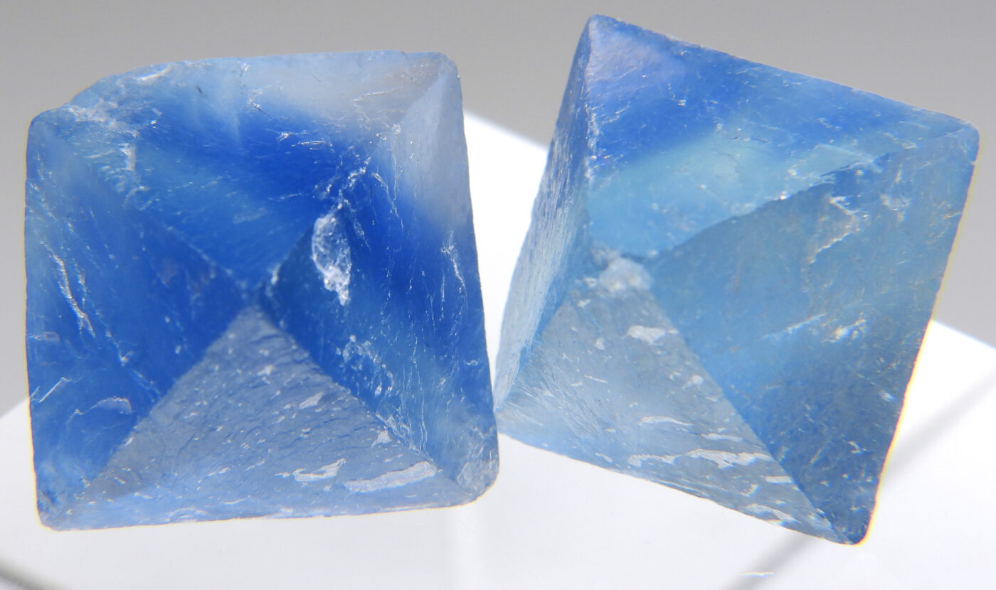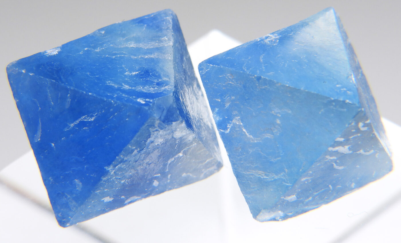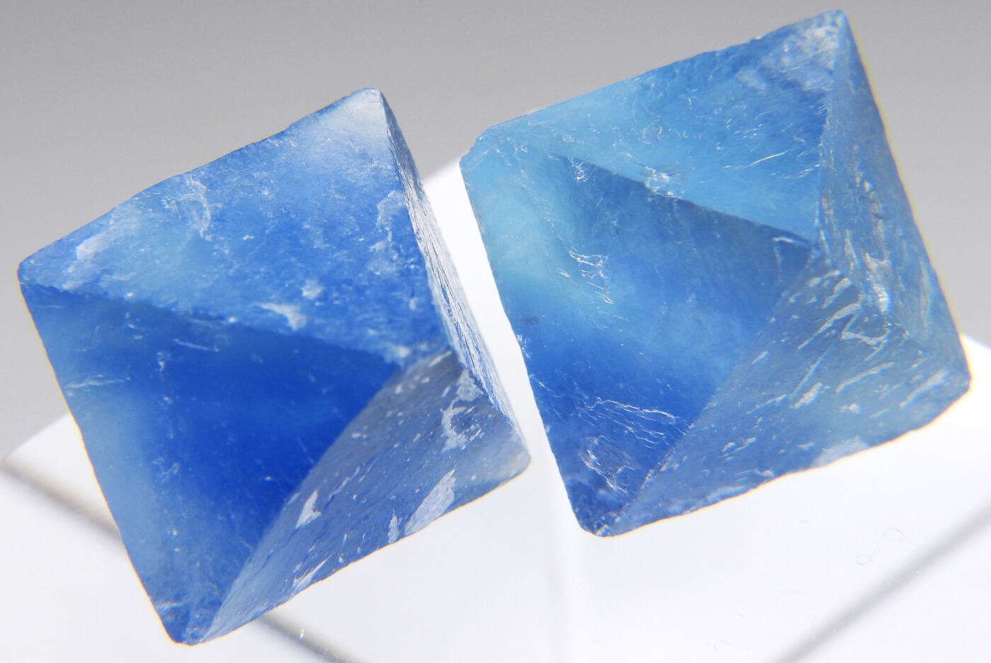 ニューメキシコのブルーフローライトを劈開面に沿って八面体にカットした標本です。白熱灯下でカラーチェンジします。2個セット。