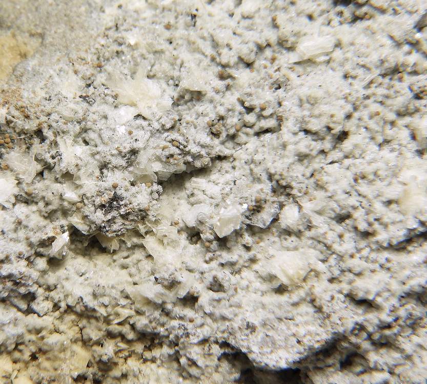 空隙に成長した鱗珪石の結晶群です。