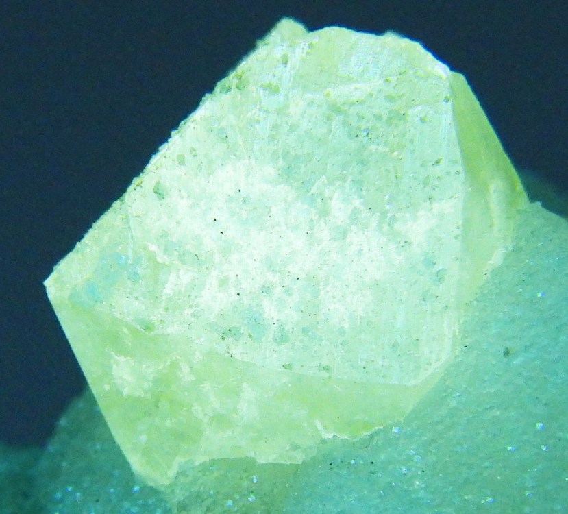 八面体で産するCaのモリブデン酸塩鉱物。紫外線短波で明るい蛍光を発します。