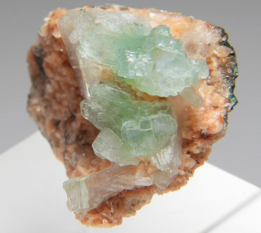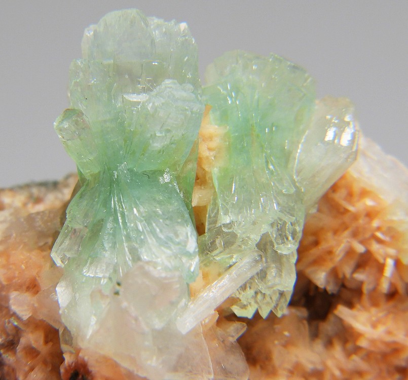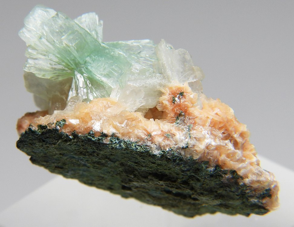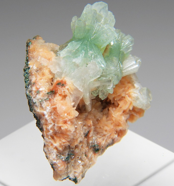 輝沸石と束沸石に共生した放射状の美しいグリーン魚眼石の結晶群です。