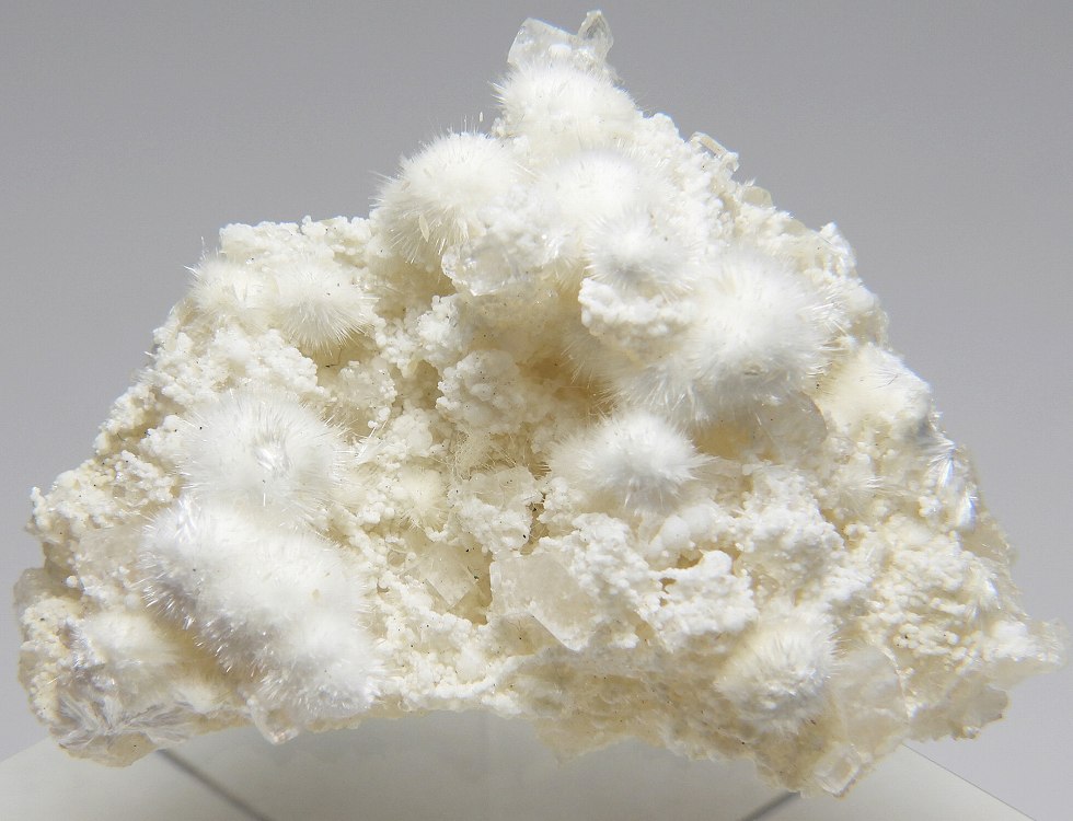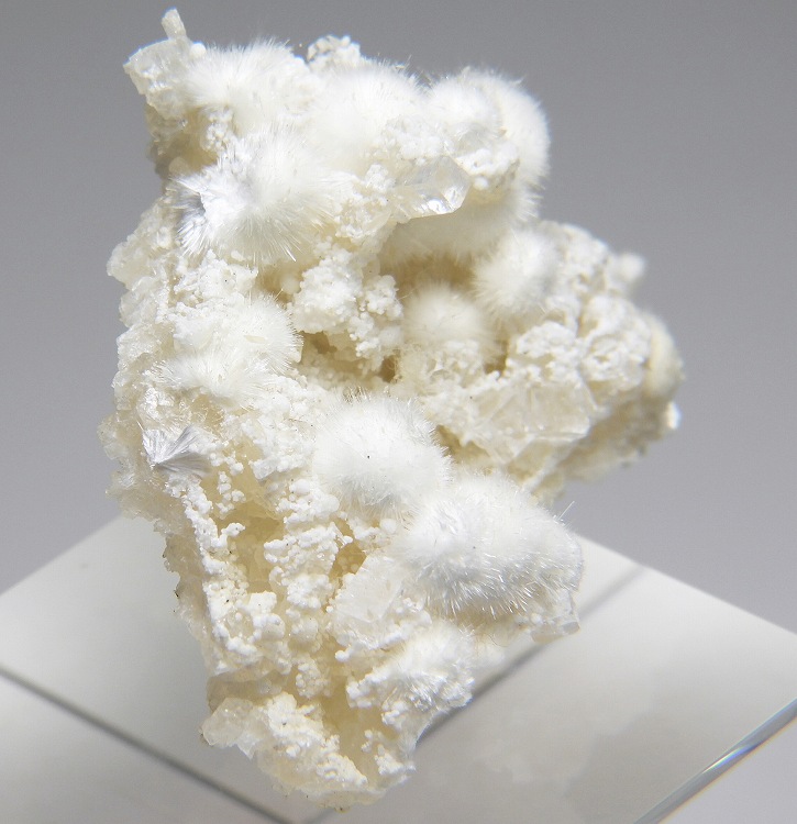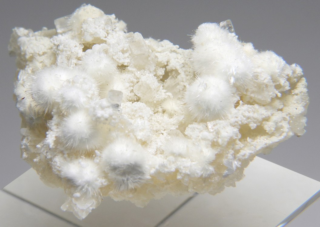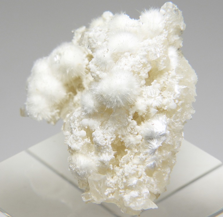 ぶどう石上に成長したオーケン石の結晶群。魚眼石とギロル石が共生します。