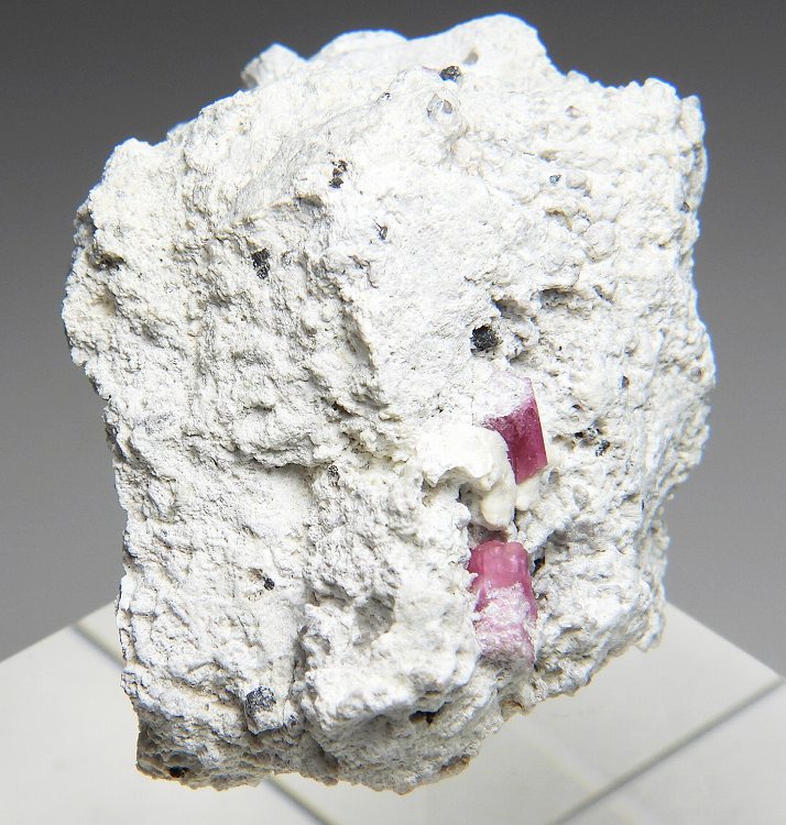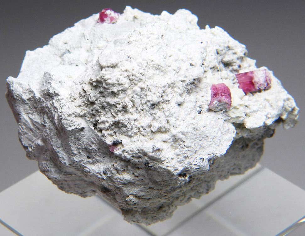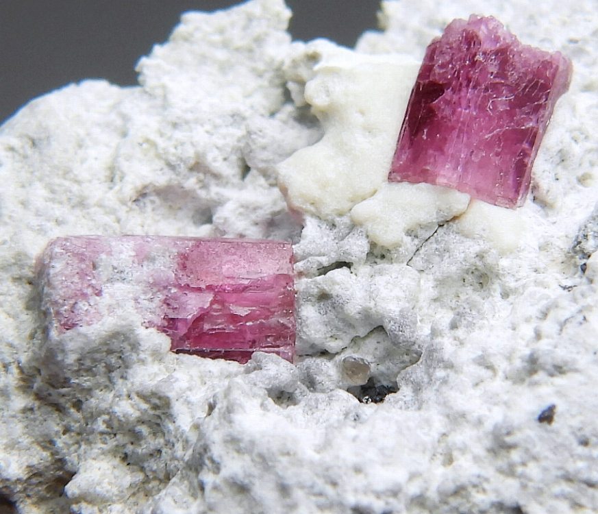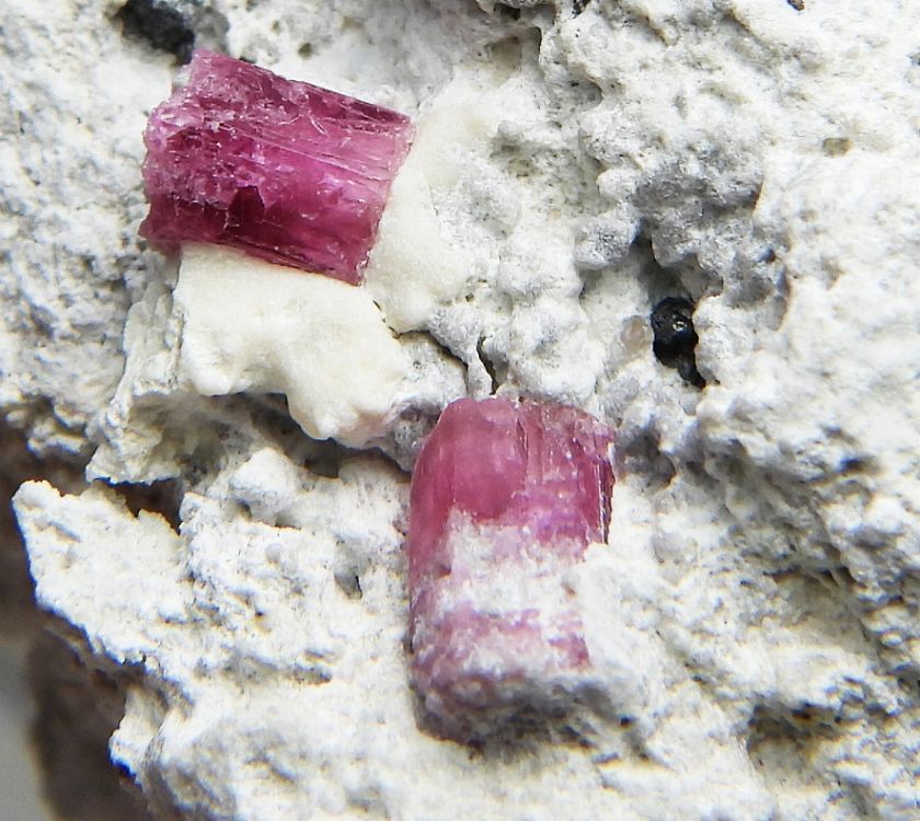 流紋岩中に見られるレッドベリルの美しい結晶群です。最大結晶は表出部分で6.5mmあります。