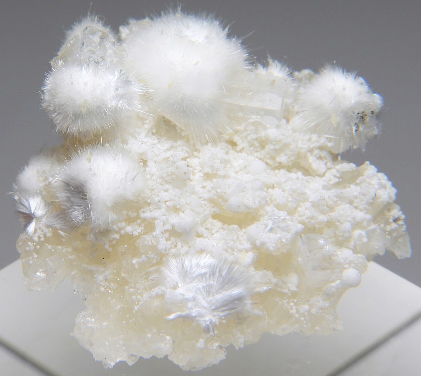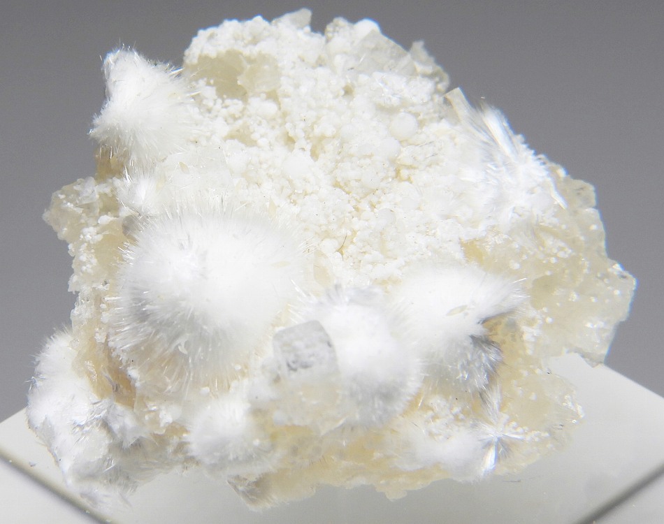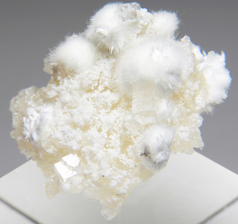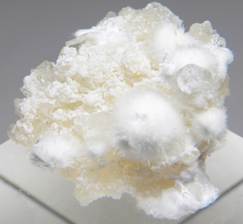 ぶどう石上に成長したオーケン石の結晶群。魚眼石とギロル石が共生します。