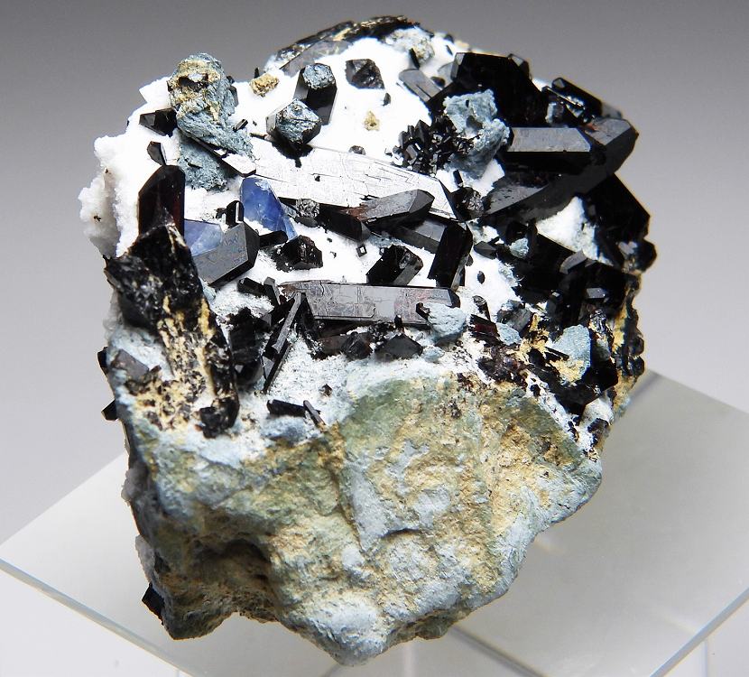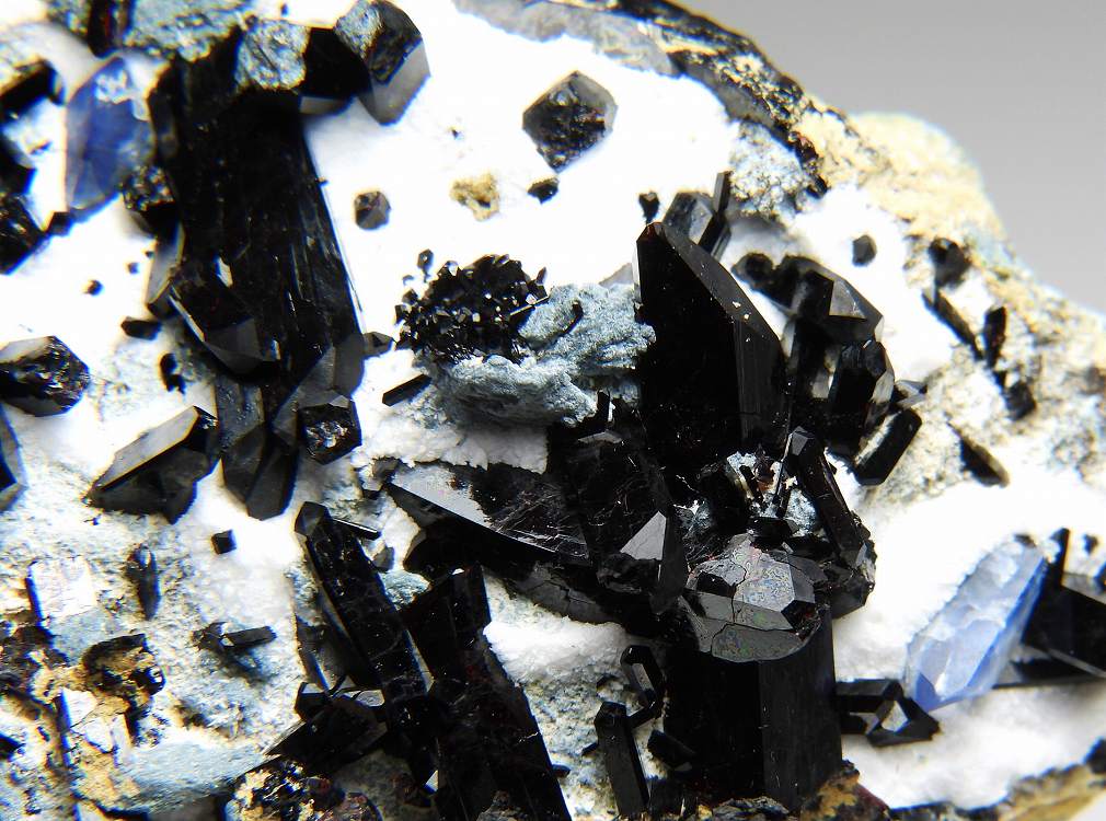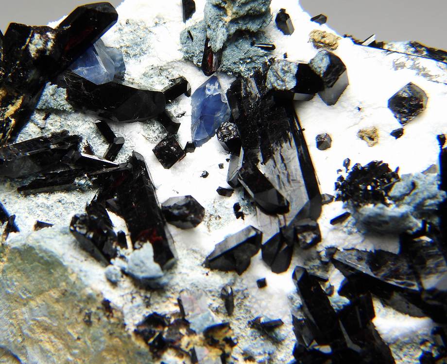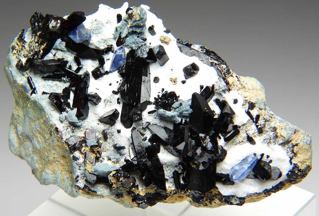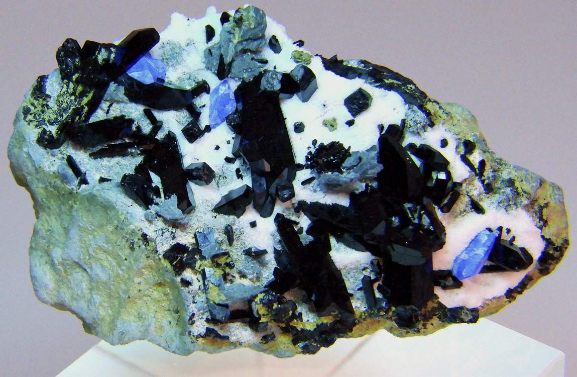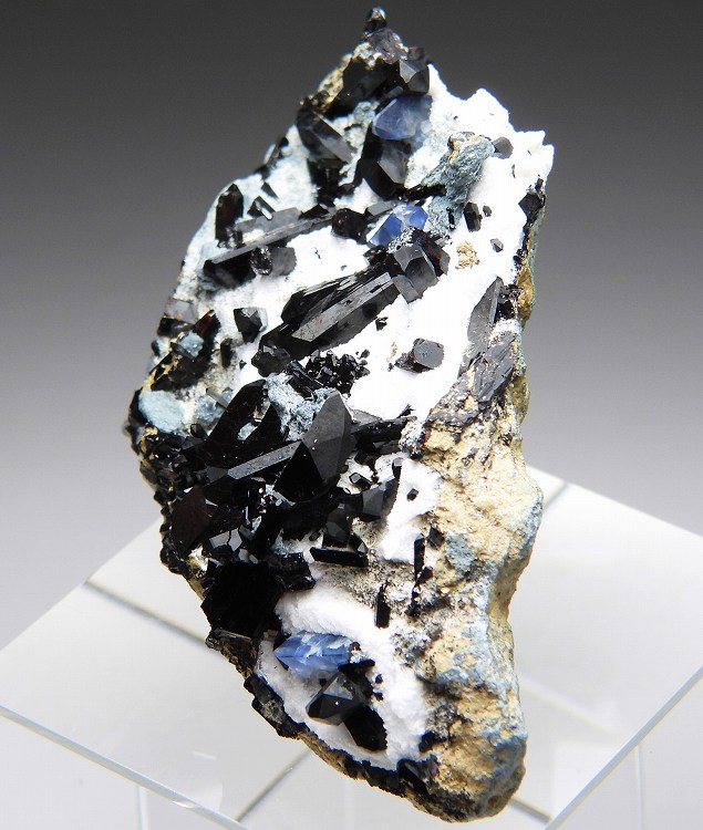 端正なベニト石に海王石が共生します。紫外線短波で明るい蛍光を発します。