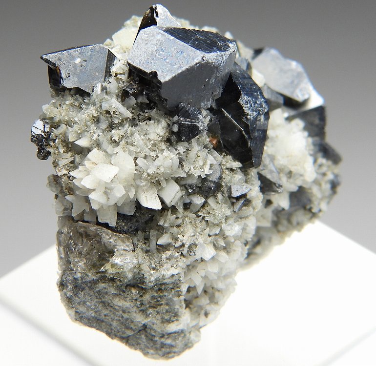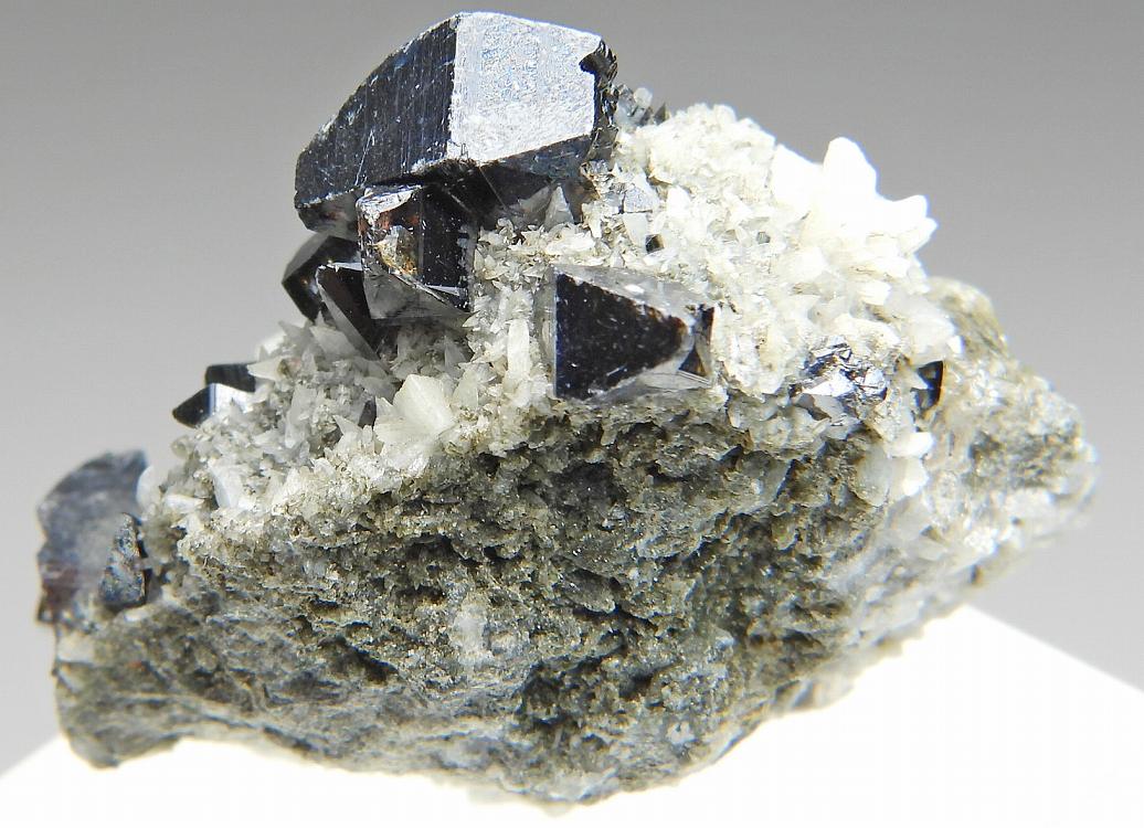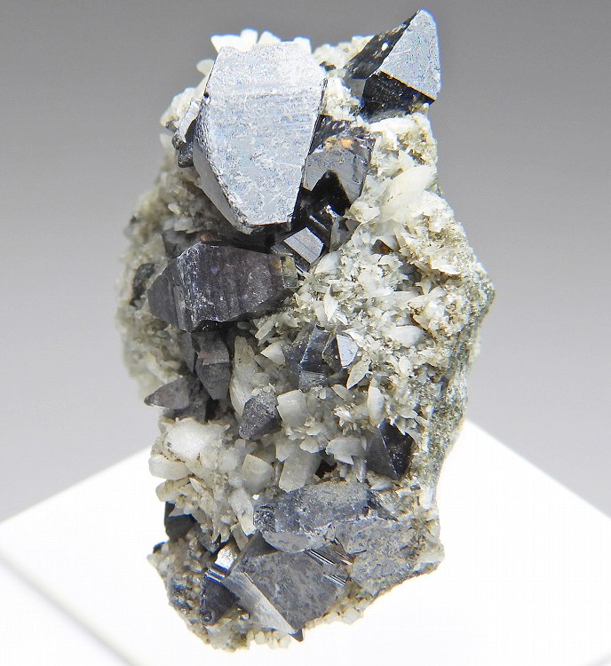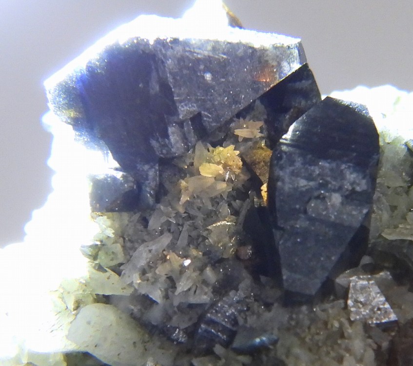 大きく成長した鋭錐石の結晶群。強い光源で透過光をごく僅かに見ることができます。