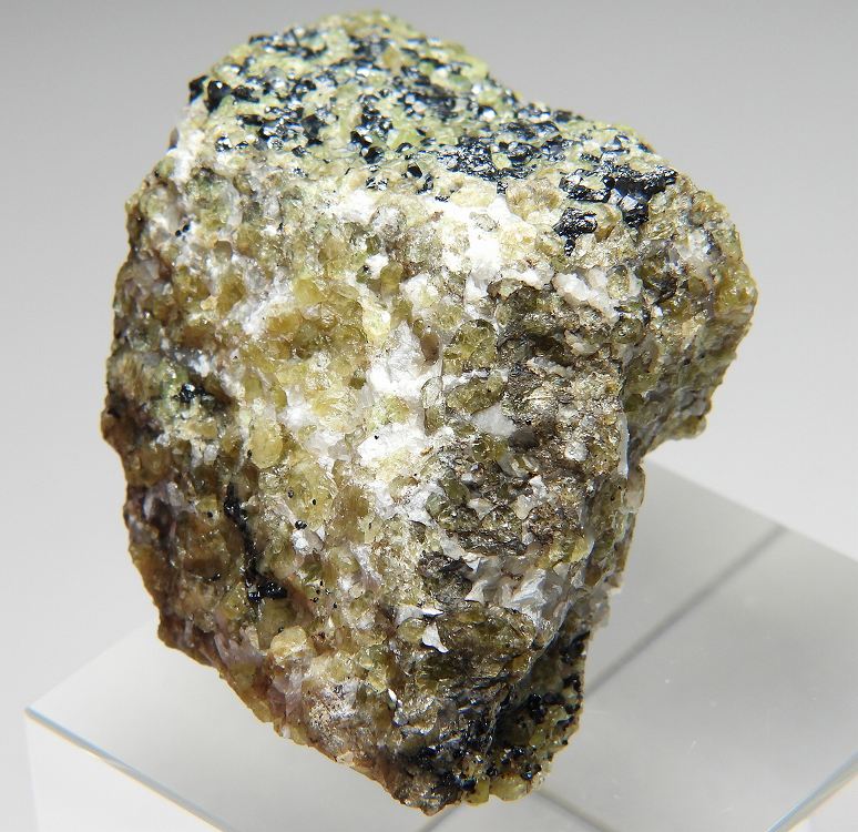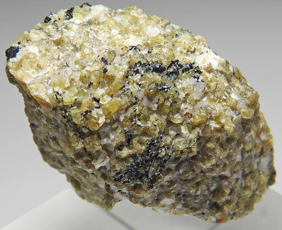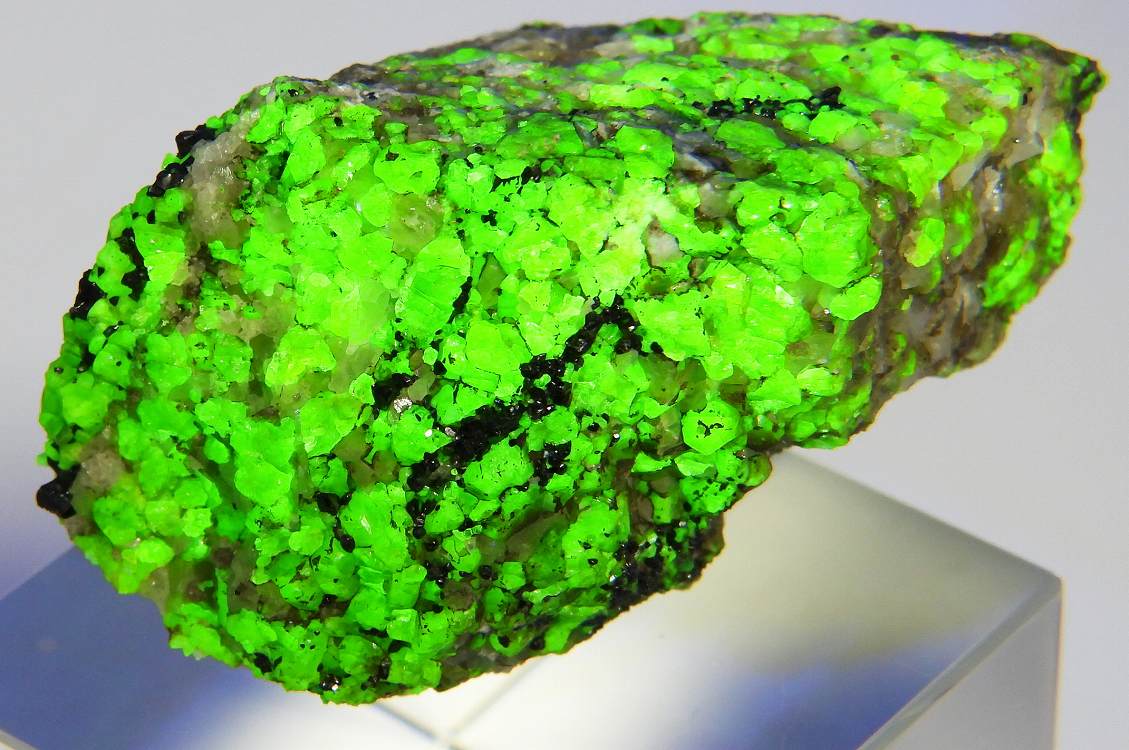 希少なライトグリーンの珪亜鉛鉱。フランクリン鉄鉱や紅亜鉛鉱を伴います。紫外線長波/短波のどちらでも蛍光を発します。