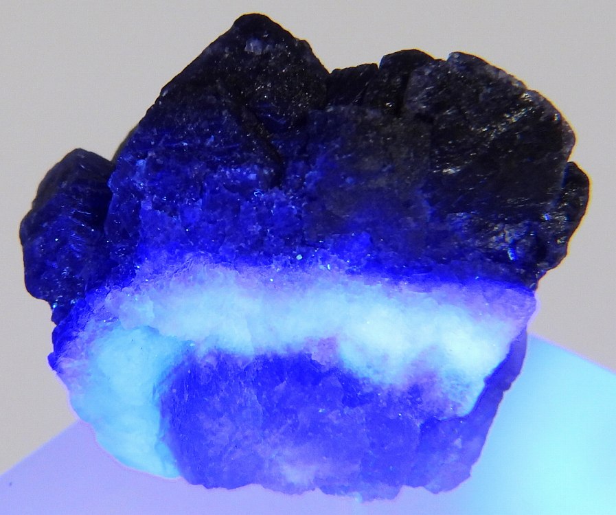 濃色パープルの八面体結晶群。下層の青色部分は紫外線長波で蛍光します。