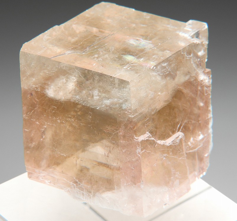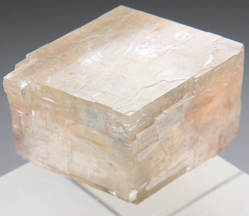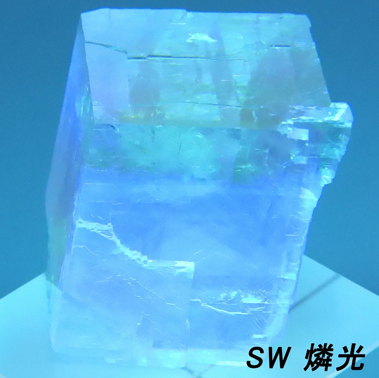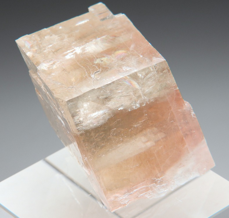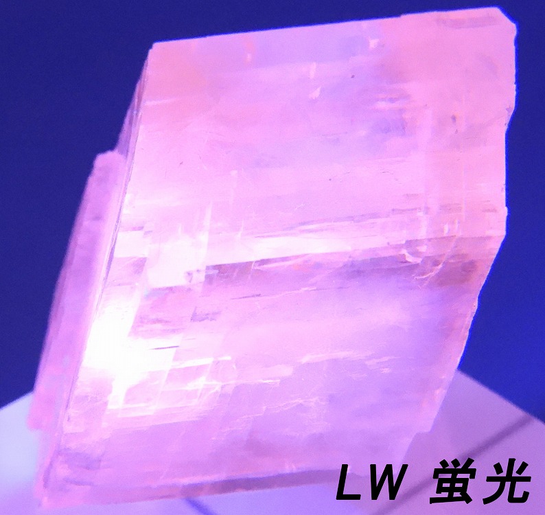 透明度の高いペールオレンジのオプティカルカルサイト。紫外線長波で蛍光し短波照射後には強い燐光を発します。