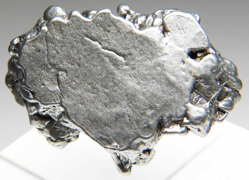 切断面に黒っぽく見える珪酸塩鉱物を含む特徴のあるグループIAB-MGに分類される鉄隕石です。切断研磨面を酸処理すると粗粒のウィドマンシュテッテン構造があらわれます。未切断標本。