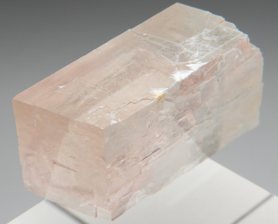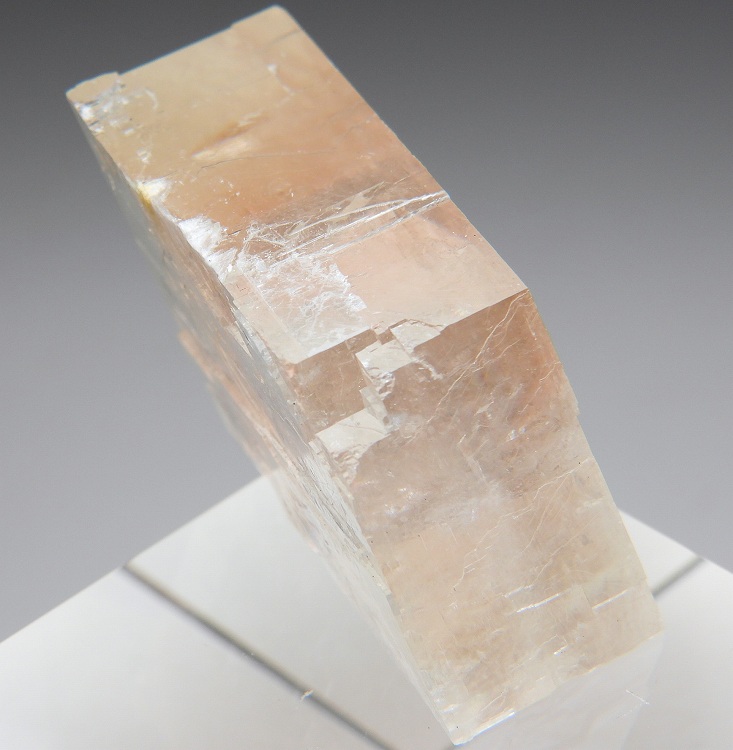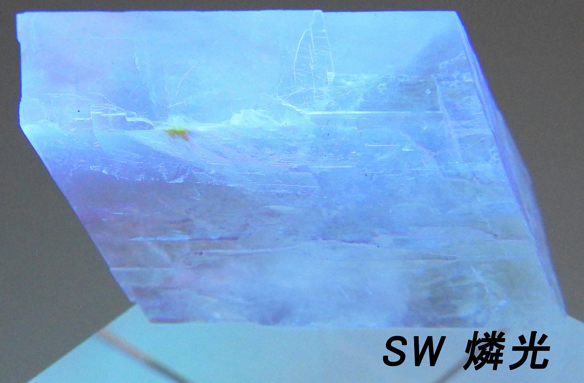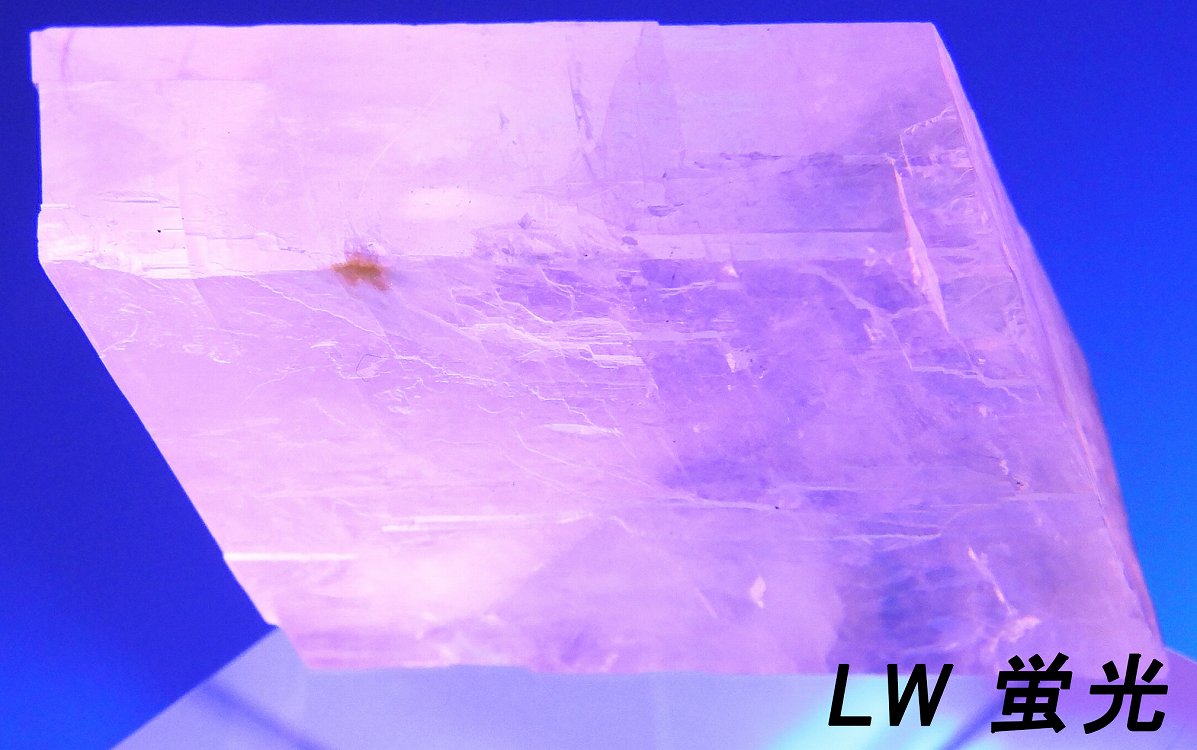透明度の高いペールオレンジのオプティカルカルサイト。紫外線長波で蛍光し短波照射後には強い燐光を発します。