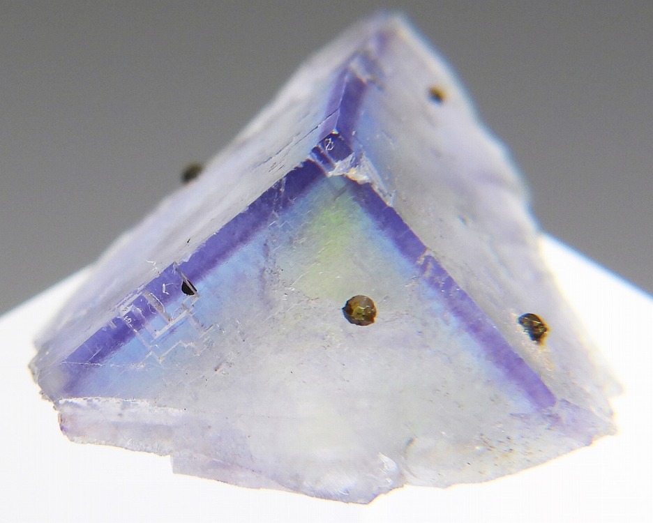 パープル、マリンブルー、イエローのゾーニングが美しいマルチカラーの結晶群。紫外線長波で蛍光し白熱灯下でカラーチェンジします。