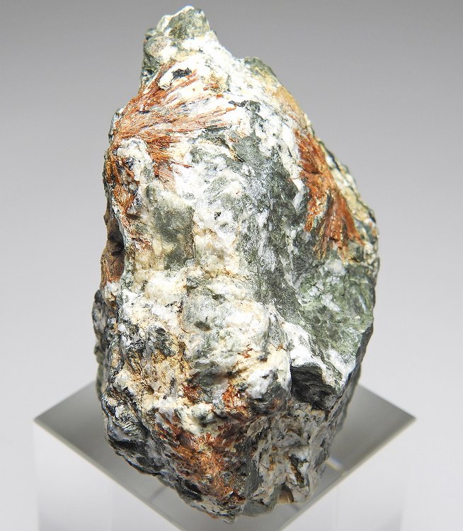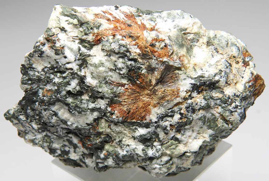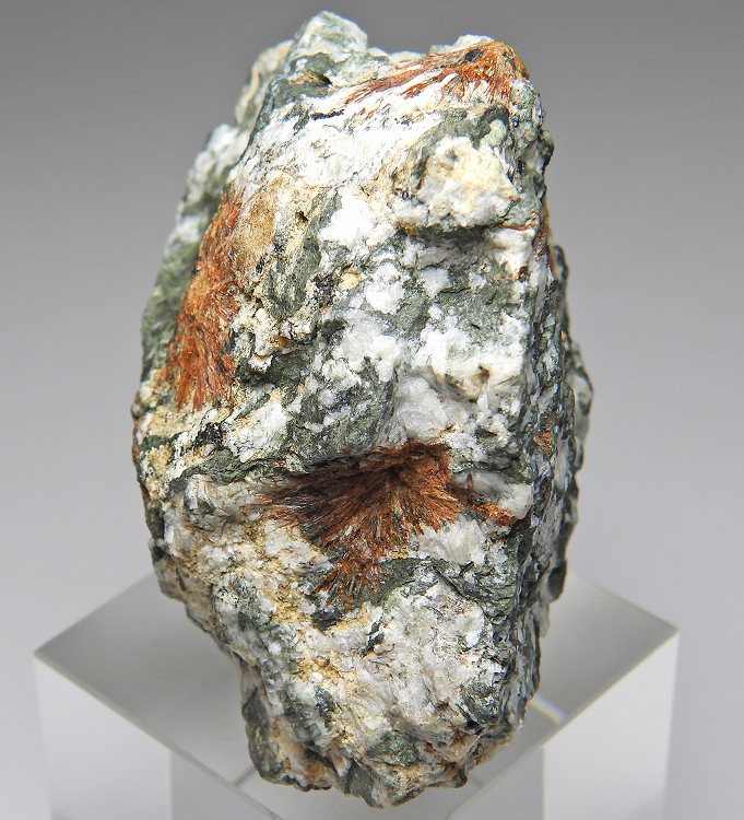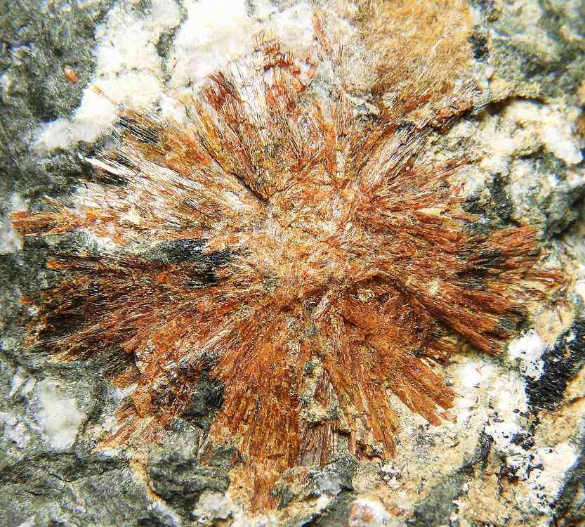 オレンジ色の放射状で産する稀産鉱物。母岩上にたくさんの結晶群が見られます。キャビネットサイズ。