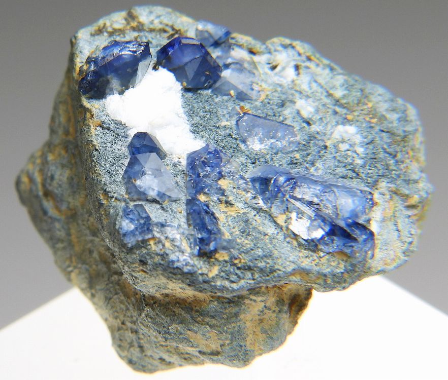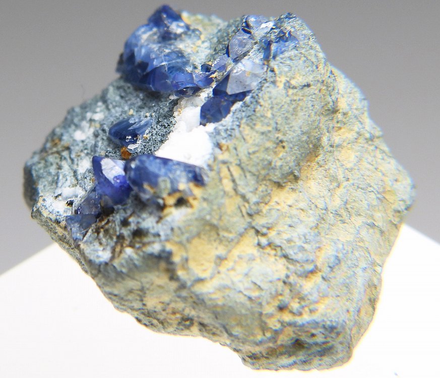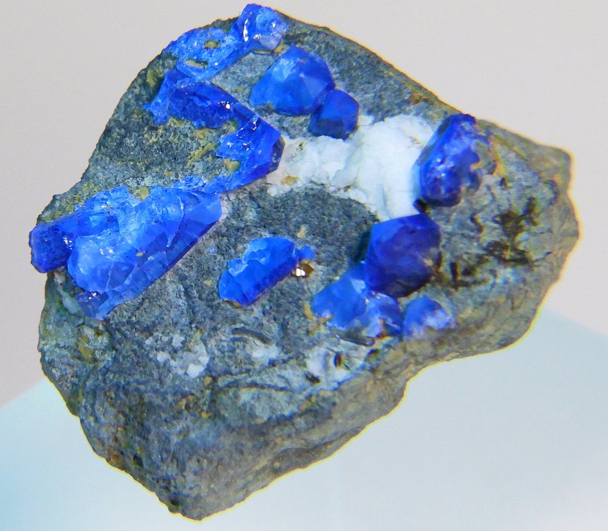 端正なベニト石の結晶群。紫外線短波で明るい蛍光を発します。