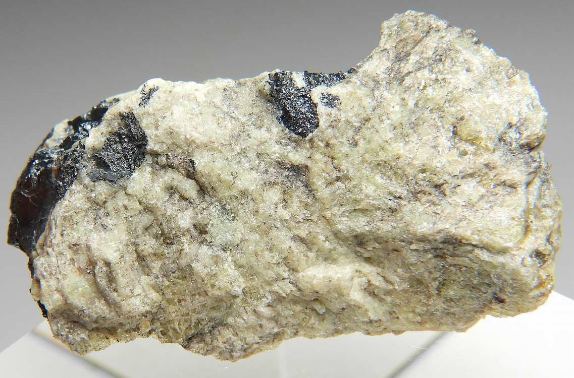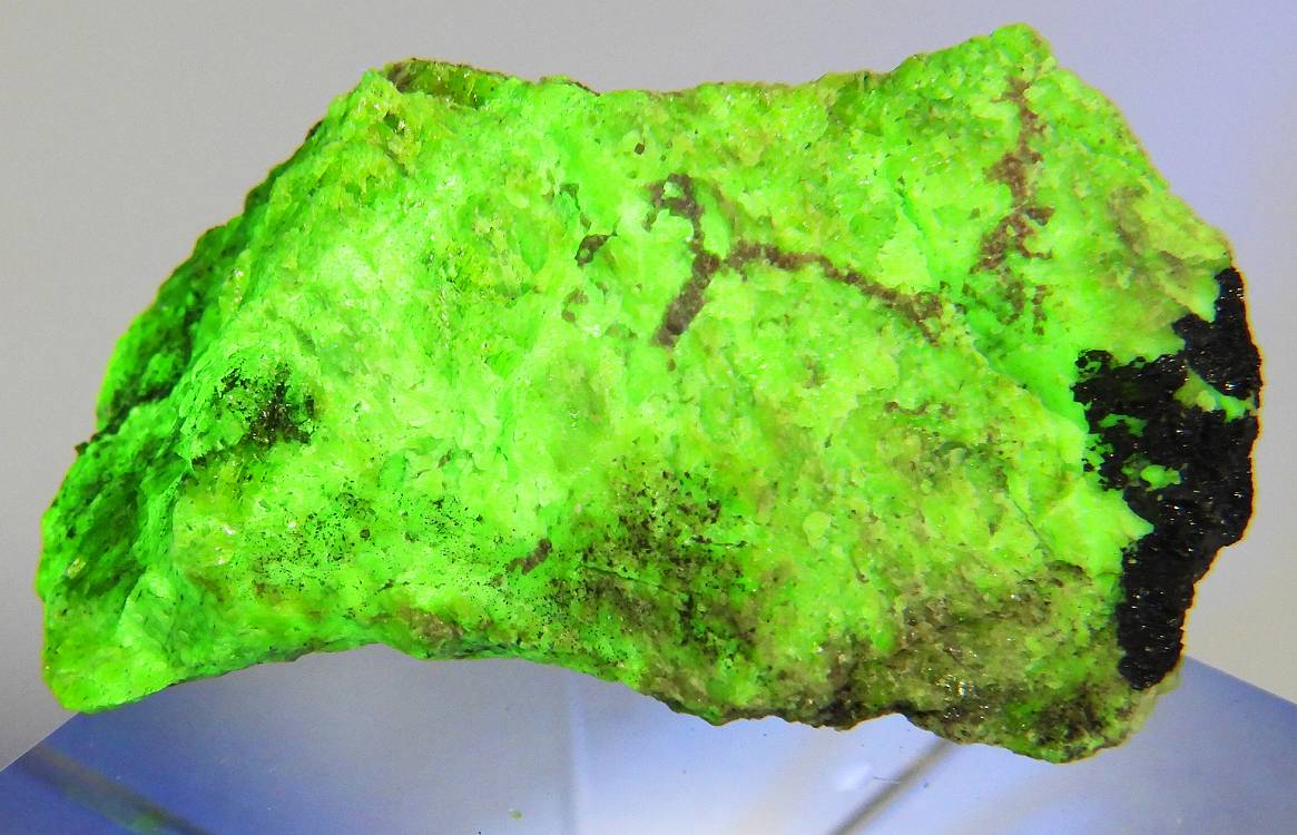 希少なライトグリーンの珪亜鉛鉱。フランクリン鉄鉱や紅亜鉛鉱を伴います。紫外線長波/短波のどちらでも蛍光を発します。